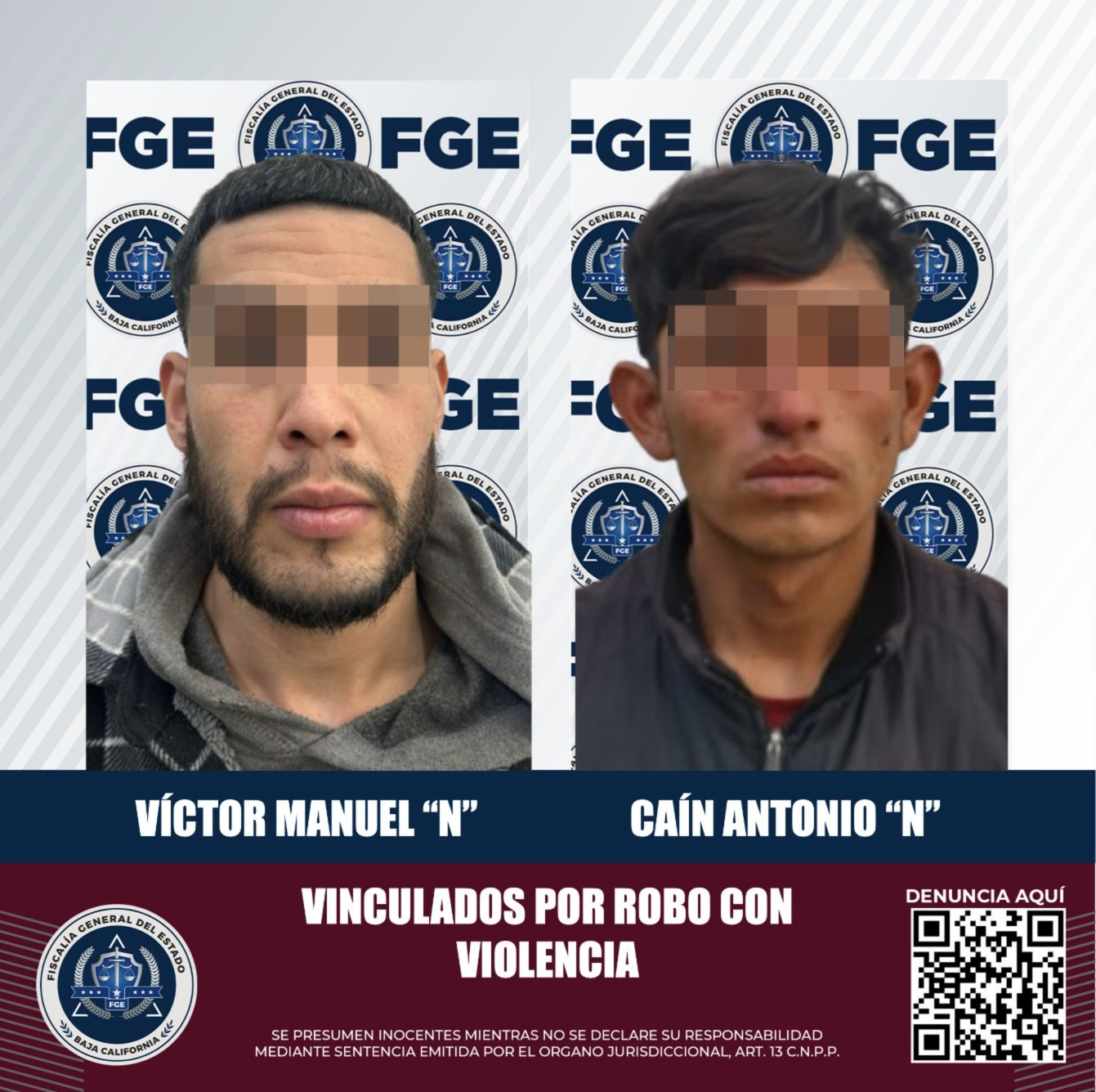 MEXICALI, BAJA CALIFORNIA. - La Fiscalía Regional de Mexicali, a través de la Unidad de Investigación de Delitos con Detenidos Poniente, logró la vinculación a proceso de dos individuos acusados de cometer robos con violencia en establecimientos comerciales.