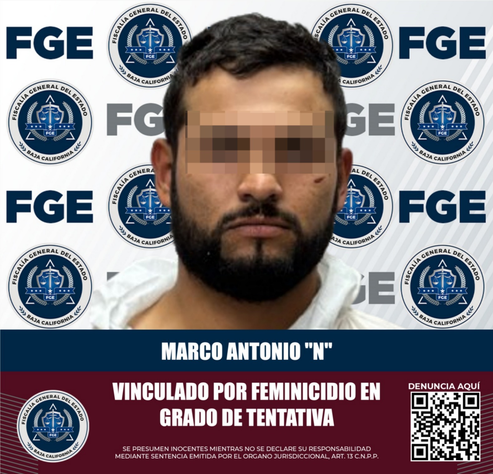 MEXICALI, BAJA CALIFORNIA. - La Fiscalía General del Estado (FGE), a través de la Fiscalía Especializada en Delitos contra la Vida, logró, con base en los elementos presentados, el inicio del proceso penal contra Marco Antonio “N”, de 24 años, acusado de feminicidio en grado de tentativa.