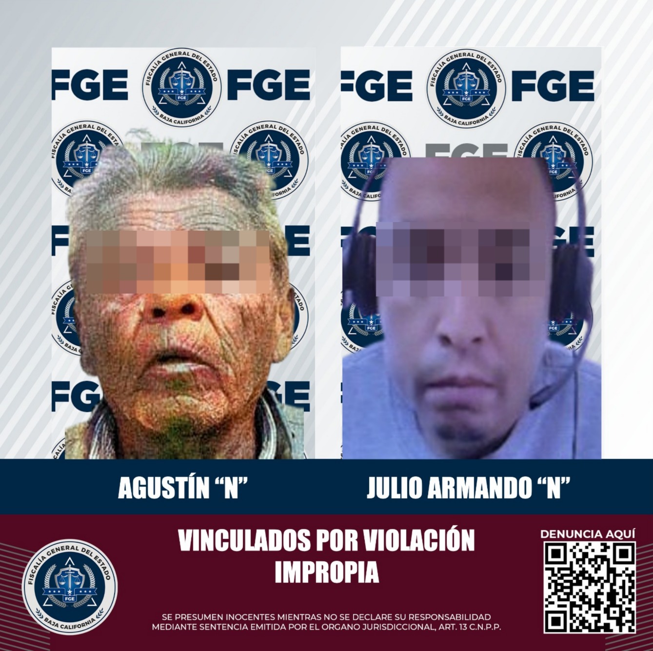 TIJUANA, BAJA CALIFORNIA. - La Fiscalía General del Estado (FGE), a través de la Fiscalía Especializada en Delitos contra la Mujer por Razón de Género, informa sobre la obtención de dos vinculaciones a proceso en distintos casos relacionados con el delito de violación impropia. Los imputados, Agustín “N” y Julio Armando “N”, enfrentarán un plazo de investigación complementaria de dos meses.