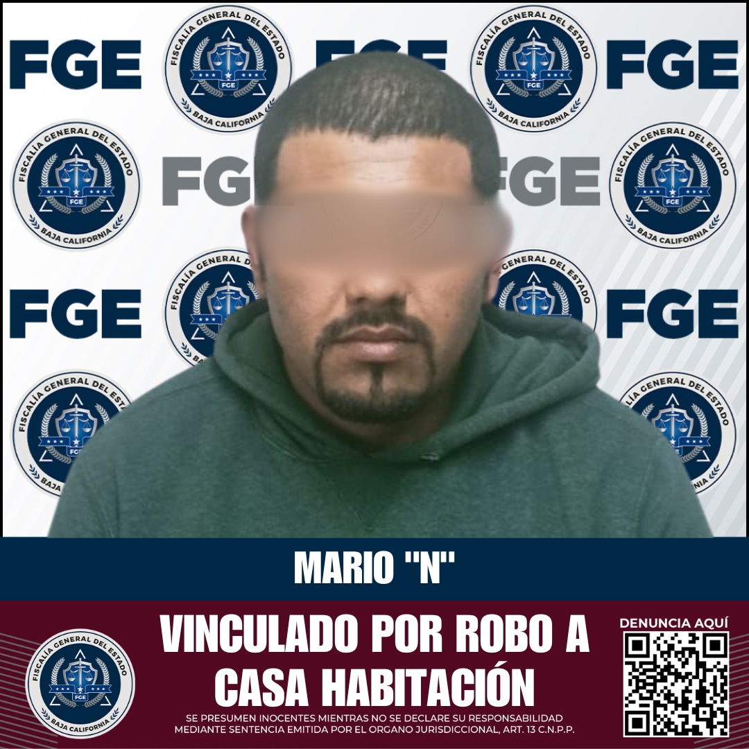 ENSENADA, BAJA CALIFORNIA. - La Fiscalía Regional de Ensenada, a través de efectivas investigaciones, logró vincular a proceso a Mario “N” por su presunta participación en robos a viviendas, ocurridos el pasado 9 de enero en el fraccionamiento Villas del Real I.