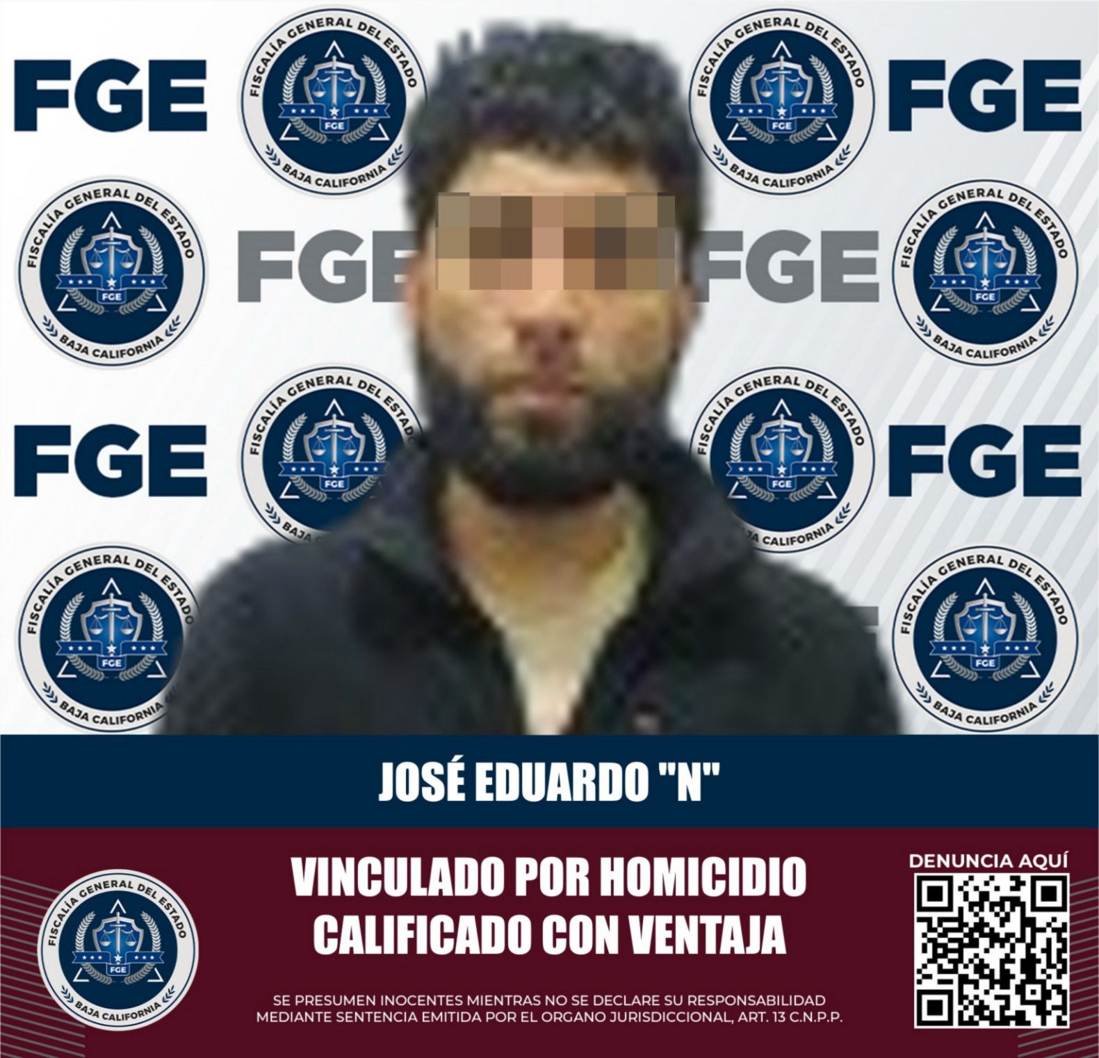 TIJUANA, BAJA CALIFORNIA. - La Fiscalía General del Estado (FGE) informa que, como resultado de las investigaciones realizadas, se logró la vinculación a proceso de José Eduardo "N", alias "El Chicho", por su presunta responsabilidad en el delito de homicidio calificado con ventaja.