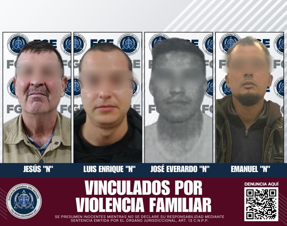 ENSENADA, BAJA CALIFORNIA. - La Fiscalía Regional de Ensenada logró la vinculación a proceso de cuatro hombres por presuntos actos de violencia familiar, imponiéndose medidas cautelares.