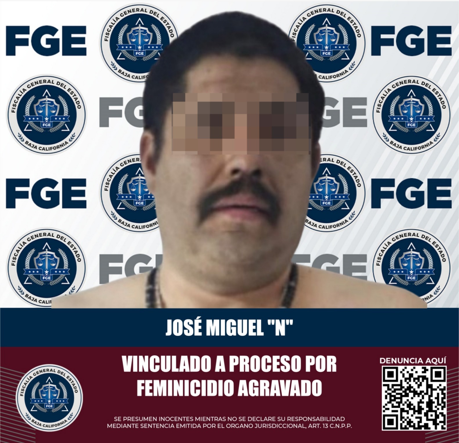 TIJUANA, BAJA CALIFORNIA. - La Fiscalía General del Estado, a través de la Fiscalía Especializada en Delitos Contra la Vida, dio a conocer que se logró la vinculación a proceso de José Miguel “N”, por el delito de feminicidio agravado; esto derivado de la presentación de datos de prueba en su contra.