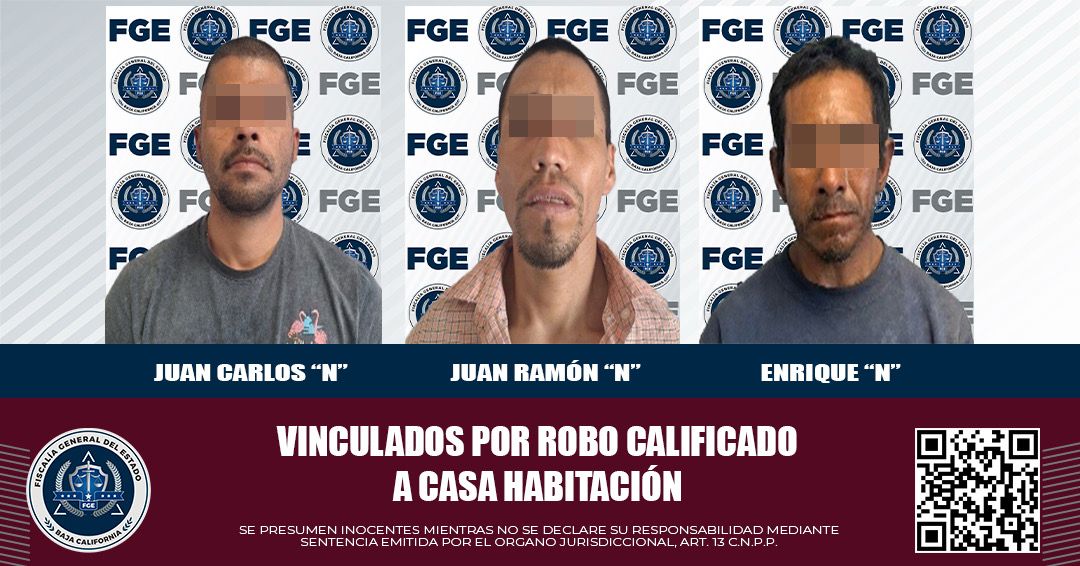 MEXICALI, BAJA CALIFORNIA. - La Fiscalía Regional de Mexicali logró, la vinculación a proceso de tres hombres acusados del delito de robo calificado a casa habitación, hecho ocurrido en el fraccionamiento Portales.