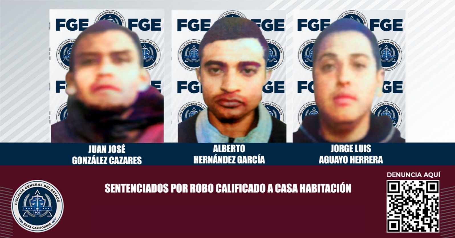 TIJUANA, BAJA CALIFORNIA. - Tres hombres fueron sentenciados a 3 años, 8 meses en prisión, más el pago de una multa, por cometer el delito de robo calificado a casa habitación, en un hecho registrado el día 7 de marzo de 2025, en Tijuana, Baja California.