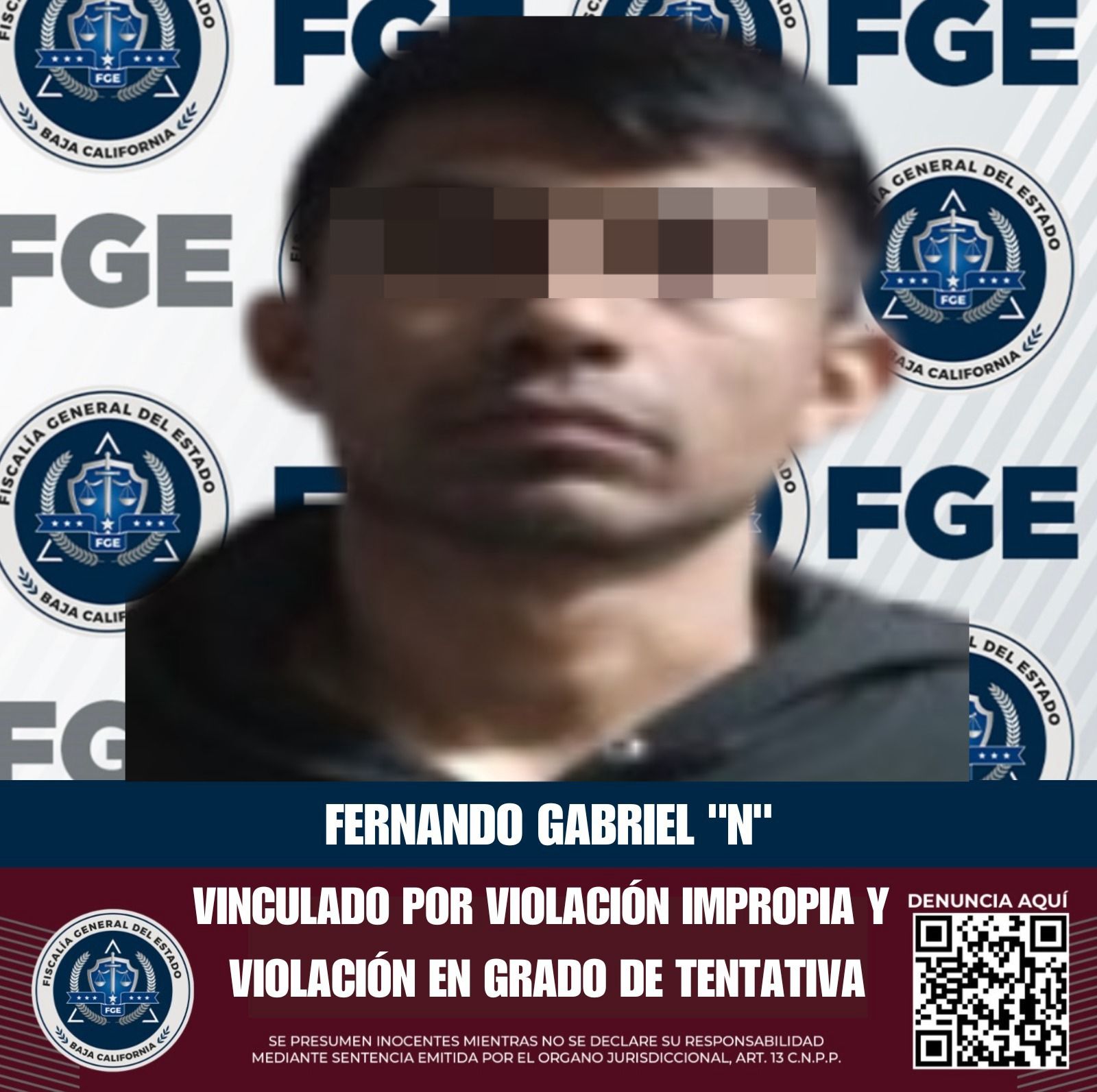 TIJUANA, BAJA CALIFORNIA. - La Fiscalía General del Estado de Baja California (FGEBC), a través de la Unidad de Investigación Especializada en Delitos Sexuales, adscrita a la Fiscalía Especializada en Delitos Contra Mujeres por Razón de Género, informa sobre la vinculación a proceso penal de Fernando Gabriel “N”, por su presunta responsabilidad en la comisión de los delitos de violación impropia y violación en grado de tentativa.