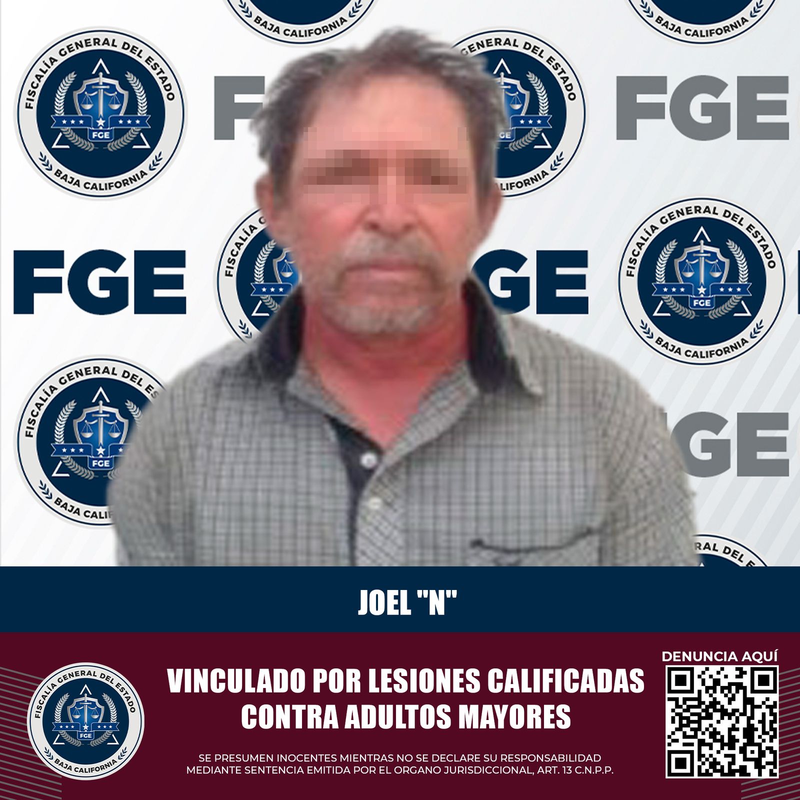 MEXICALI, BAJA CALIFORNIA. - La Fiscalía General del Estado, a través de la Unidad de Investigación con Detenidos Poniente de la Fiscalía Regional de Mexicali, obtuvo auto de vinculación a proceso contra Joel “N”, señalado como presunto responsable de agredir físicamente a un adulto mayor.