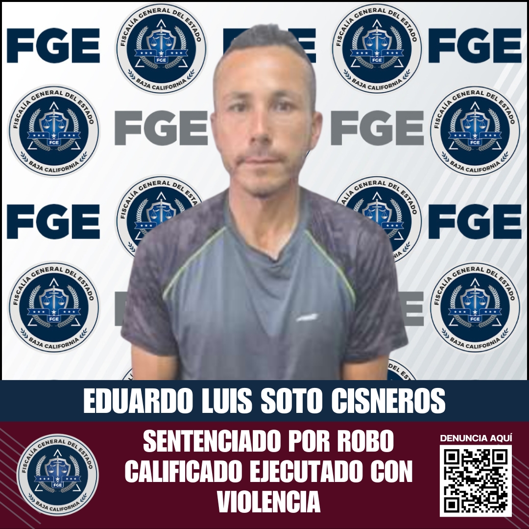 ENSENADA, BAJA CALIFORNIA. - Como resultado de las investigaciones realizadas por la Fiscalía Regional de Ensenada, a través de la Unidad de Investigación de Robos, se obtuvo una sentencia condenatoria de 4 años de prisión para Eduardo Luis Soto Cisneros, por el delito de robo calificado ejecutado con violencia.