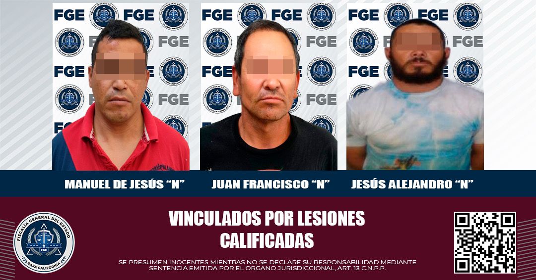 MEXICALI, BAJA CALIFORNIA. - La Fiscalía Regional de Mexicali, a través de la Unidad de Investigación con Detenidos Poniente, obtuvo la vinculación a proceso de tres hombres presuntamente implicados en delitos de lesiones calificadas, luego de presentar elementos de prueba contundentes.