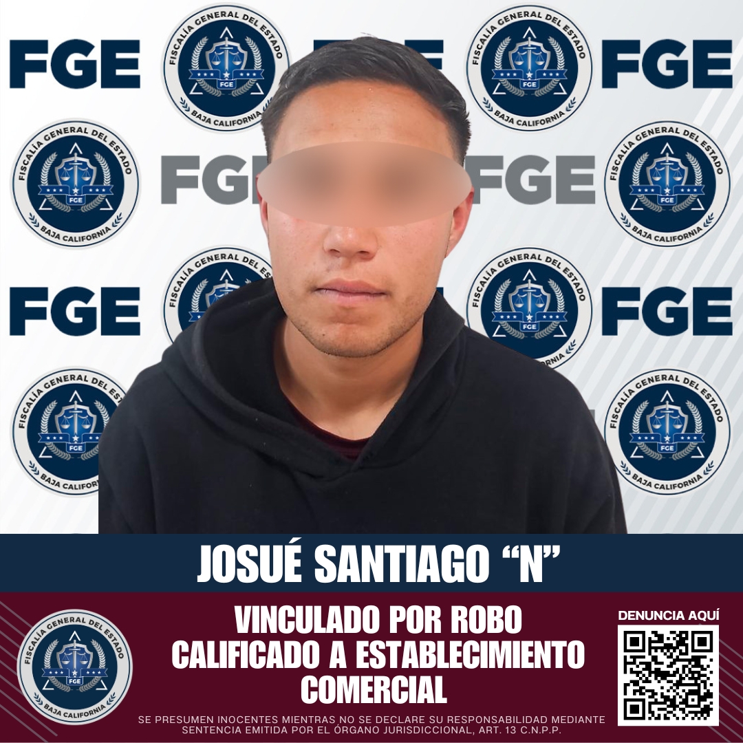 ENSENADA, BAJA CALIFORNIA. - La Fiscalía General del Estado de Baja California, a través de la Unidad de Investigación de Robos, obtuvo la vinculación a proceso de Josué Santiago “N”, por su probable responsabilidad en el delito de robo calificado cometido en establecimiento comercial con servicio al público.