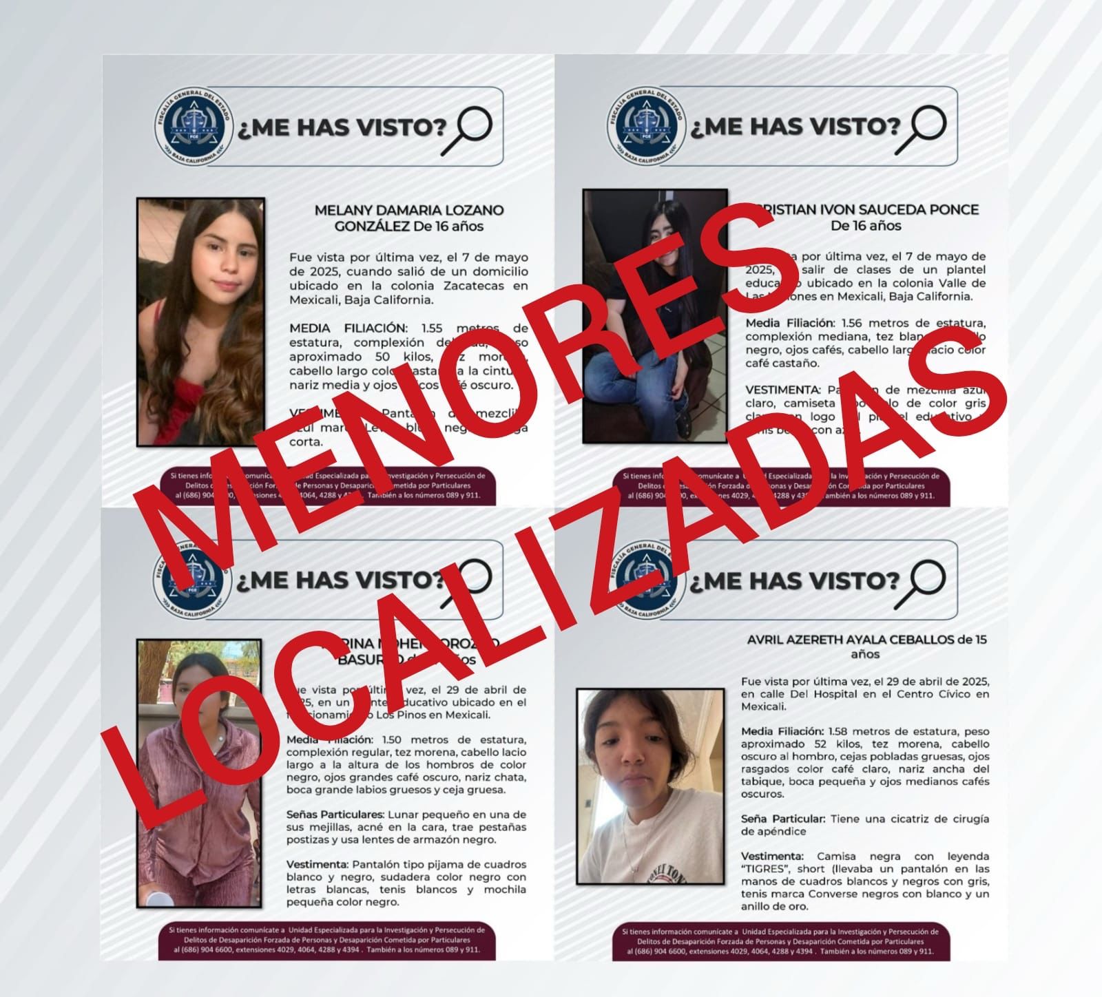 Por lo anterior, se cancelan las pesquisas generadas para la localización de Melany Damaris Lozano, Cristian Ivon Sauceda Ponce, ambas de 16 años, así como Karina Nohemí Orozco Basurto de 17 años y Avril Azereth Ayala Ceballos de 15 años.