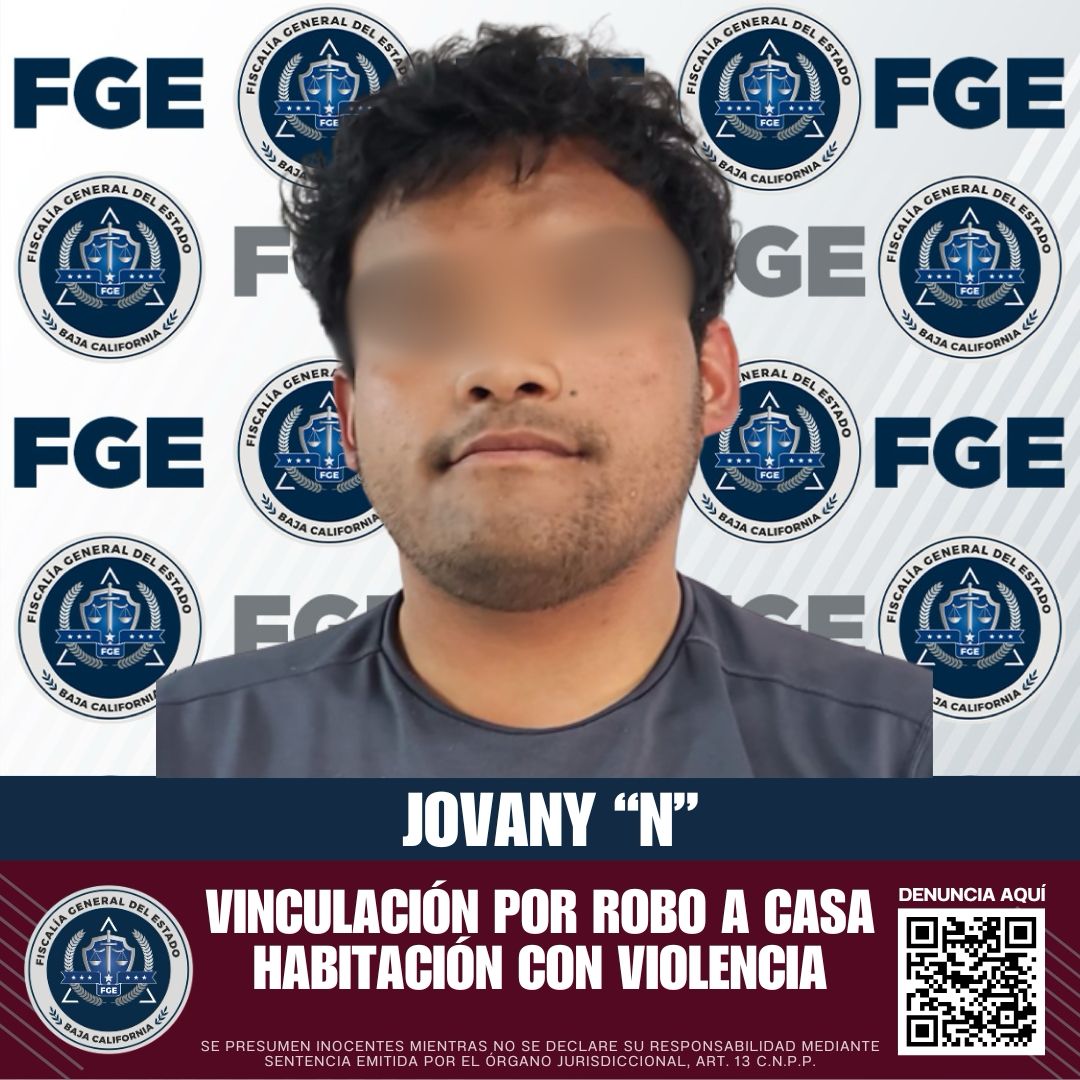 ENSENADA, BAJA CALIFORNIA. - La Fiscalía Regional de Ensenada, a través de la Unidad de Investigación de Robos, obtuvo la vinculación a proceso de Jovany “N” por el delito de robo a casa habitación con violencia.