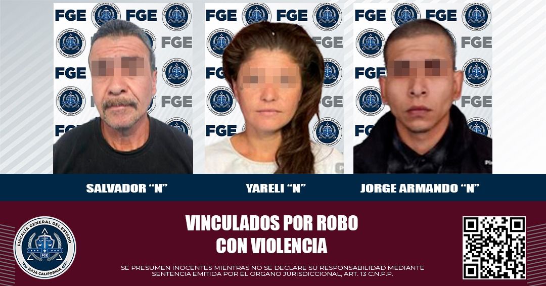 MEXICALI, BAJA CALIFORNIA. - La Fiscalía Regional de Mexicali, a través de la Unidad de Investigación Foránea de Ciudad Morelos, obtuvo la vinculación a proceso de tres personas imputadas por el delito de robo calificado a establecimiento comercial abierto al público con violencia.