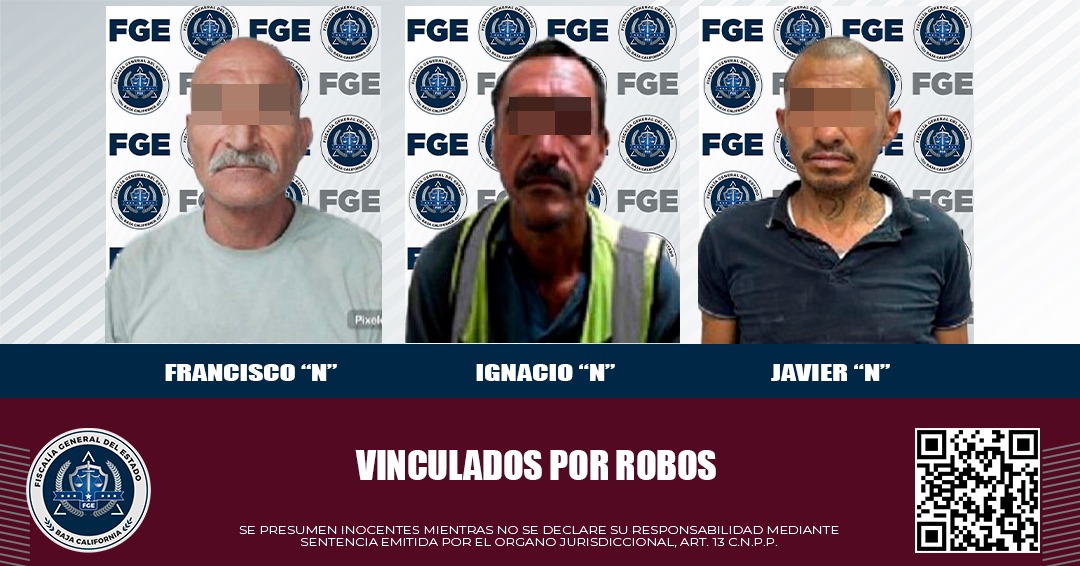 MEXICALI, BAJA CALIFORNIA. - La Fiscalía Regional de Mexicali, a través de las Unidades de Investigación de Robos Poniente y Detenidos Poniente y Foránea de Ciudad Morelos, logró, con base en datos de prueba y argumentos presentados, la vinculación a proceso de tres hombres relacionados con delitos de robo en sus diferentes modalidades.
