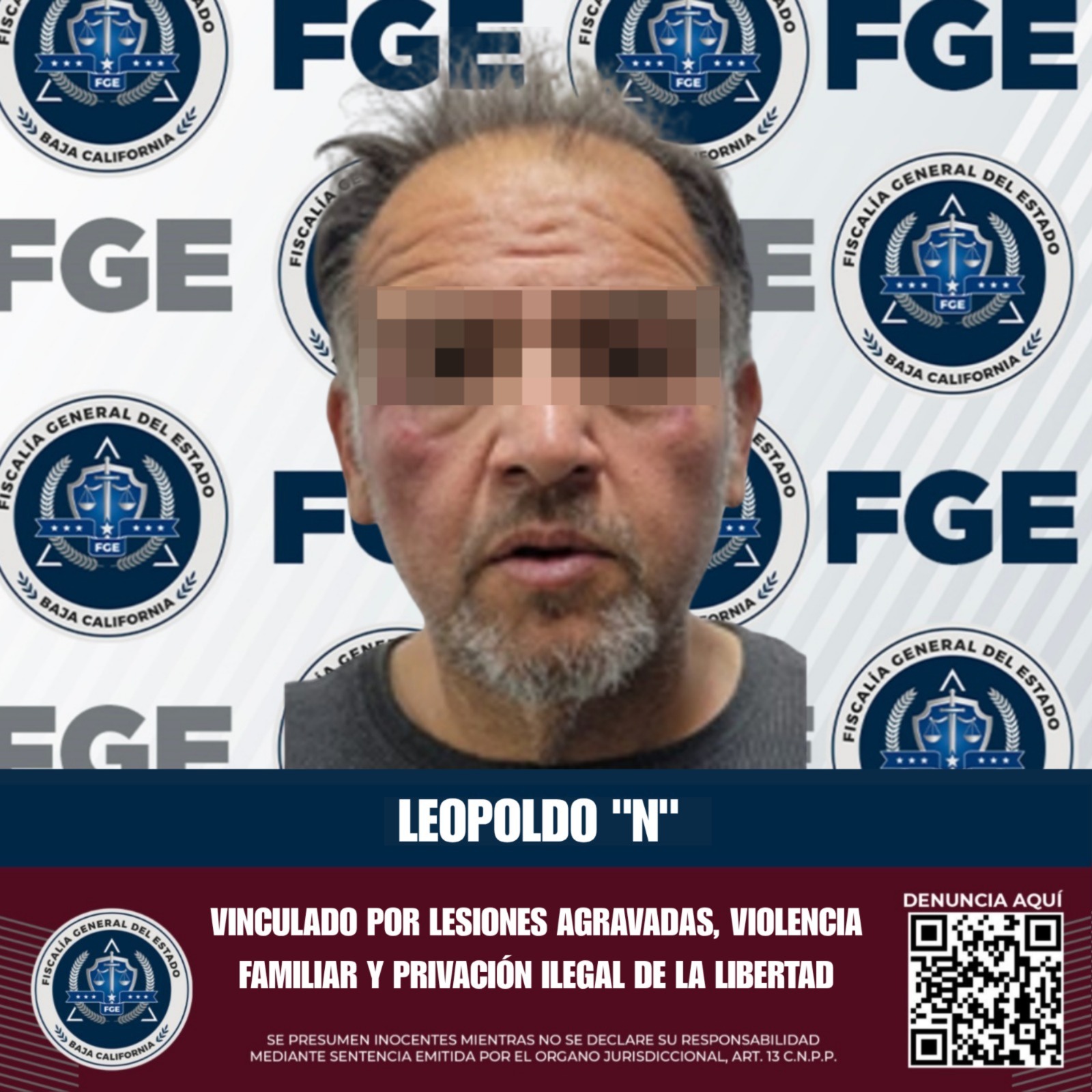 TIJUANA, BAJA CALIFORNIA. - La Unidad de Investigación con Detenido de la Fiscalía Regional de Tijuana, obtuvo la vinculación a proceso de Leopoldo “N”, por los delitos de lesiones agravadas por razón de parentesco, violencia familiar y privación ilegal de la libertad, en un hecho registrado el pasado 23 de mayo de 2025 en este municipio.