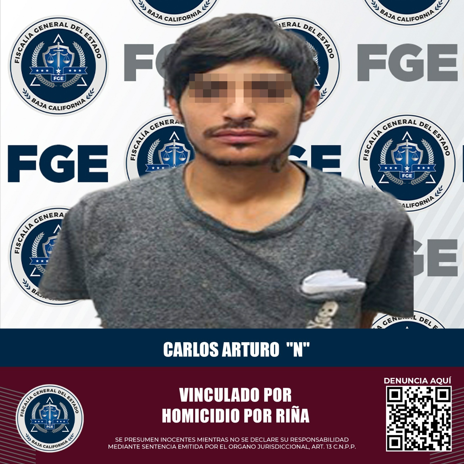MEXICALI, BAJA CALIFORNIA. - La Fiscalía General del Estado (FGE), a través de la Fiscalía Especializada en Delitos Contra la Vida, obtuvo auto de vinculación a proceso en contra de Carlos Arturo “N”, alias “El Charly”, por su presunta responsabilidad en el delito de homicidio en riña.