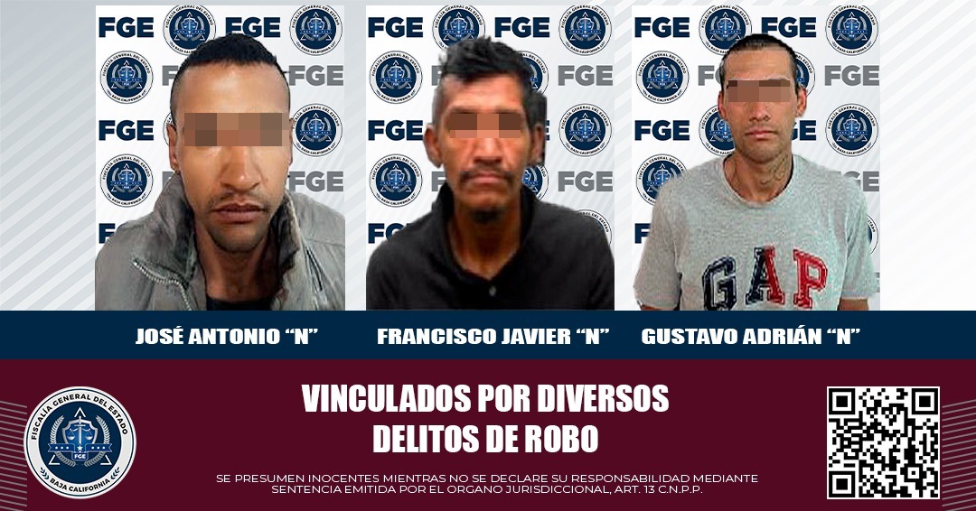 MEXICALI, BAJA CALIFORNIA. - La Fiscalía Regional de Mexicali, a través de la Unidad de Investigación de Delitos con Detenidos Oriente y Poniente, obtuvo la vinculación a proceso de tres individuos relacionados por su presunta participación en diversos delitos de robo.