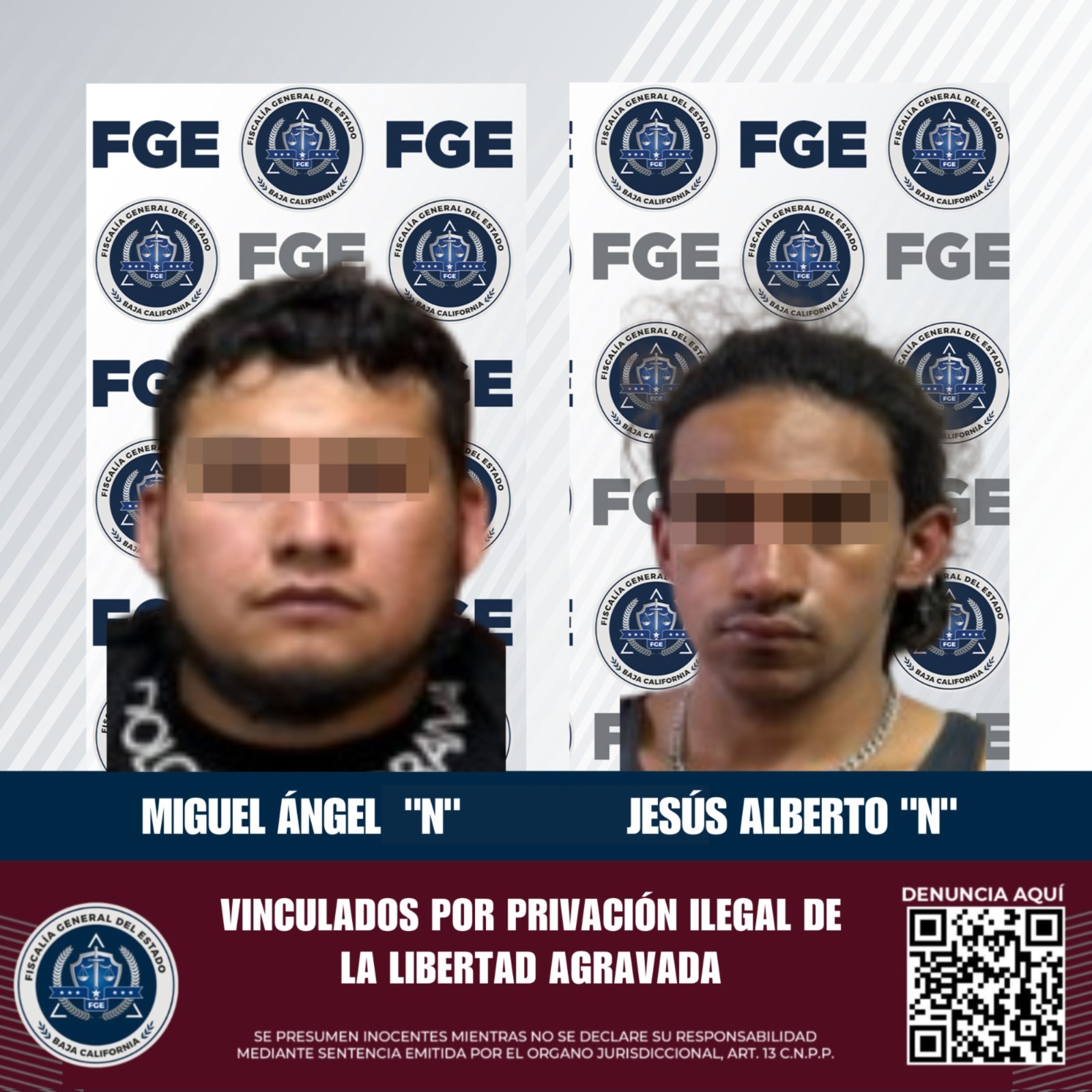 TIJUANA, BAJA CALIFORNIA. - La Fiscalía Regional de Tijuana, gracias a los trabajos de la Unidad de Investigación con detenido adscrita a esta zona, logró presentar datos de prueba contundentes, con los cuales se obtuvo la vinculación a proceso de dos masculinos por el delito de privación ilegal de la libertad agravada.