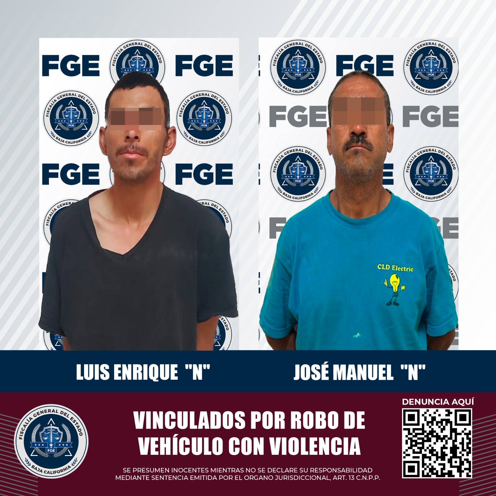 MEXICALI, BAJA CALIFORNIA. - Un par de sujetos relacionados con el robo con violencia de una camioneta Hyundai Tucson, color blanco, registrado en el ejido Guanajuato, en el Valle de Mexicali, fueron vinculados a proceso con base en los elementos probatorios presentados por la Fiscalía Regional de Mexicali.