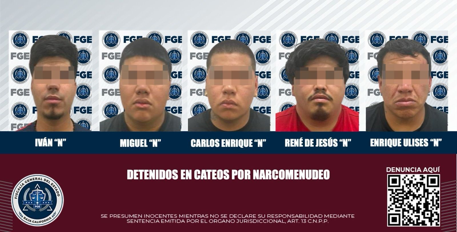 TIJUANA, BAJA CALIFORNIA. - La Fiscalía General del Estado, a través de la Fiscalía Especializada en Narcomenudeo, detuvo a cinco personas durante cateos autorizados por jueces estatales, en respuesta a reportes ciudadanos sobre actividades ilícitas en la colonia Colinas del Rey de Tijuana.