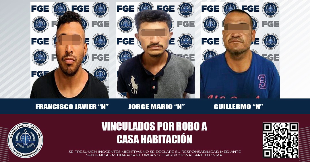 MEXICALI, BAJA CALIFORNIA. - La Fiscalía Regional de Mexicali logró la vinculación a proceso de tres hombres por el delito de robo a casa habitación, tras la celebración de audiencias por separado ante un Juez de Control.