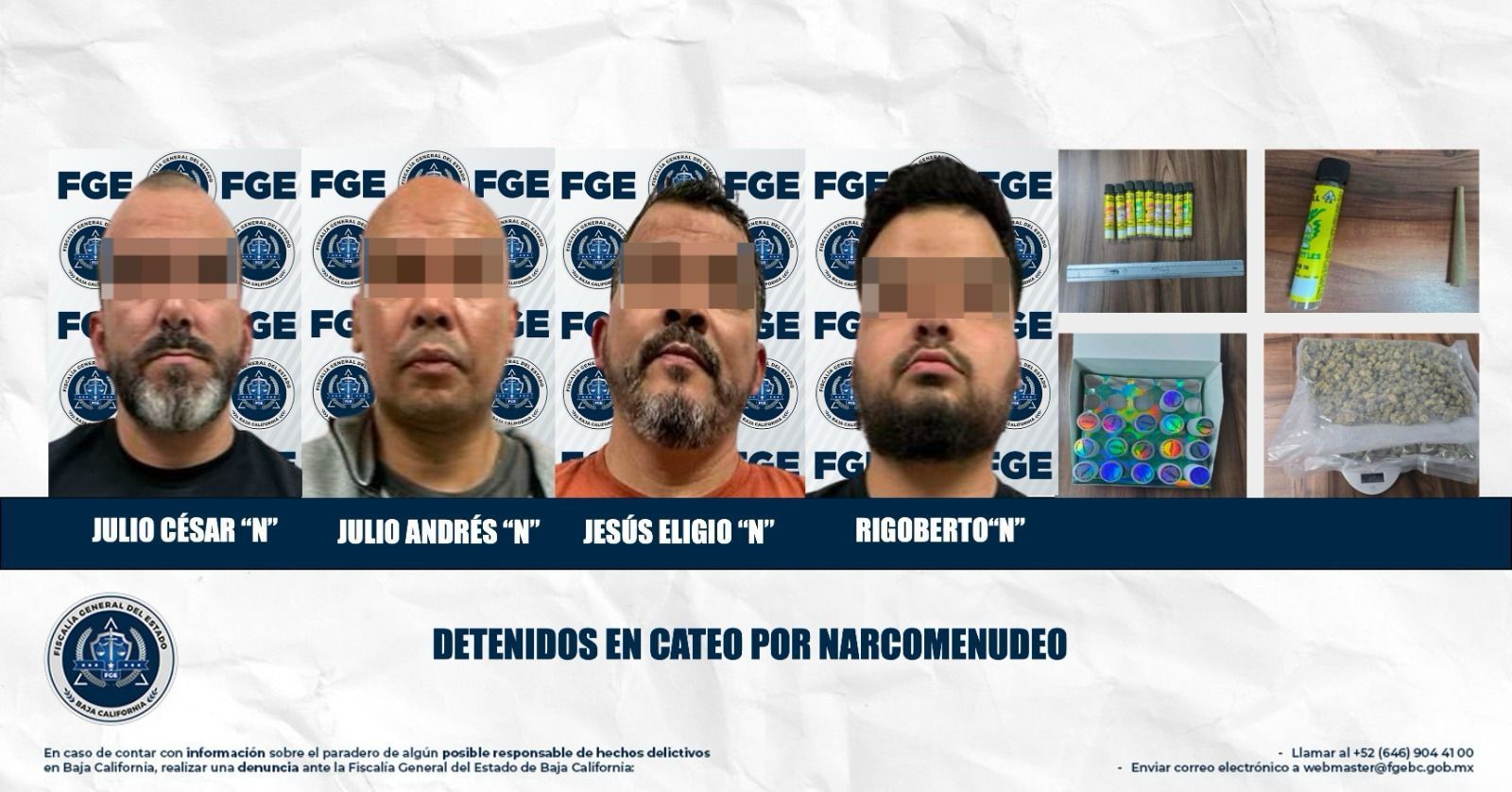 PLAYAS DE ROSARITO, BAJA CALIFORNIA. - La Fiscalía General del Estado, a través de la Fiscalía Especializada en Narcomenudeo, llevó a cabo un cateo en una negociación ubicada en la Plaza Comercial Oceana, resultando en la detención de cuatro individuos bajo sospecha de venta de drogas en el lugar.