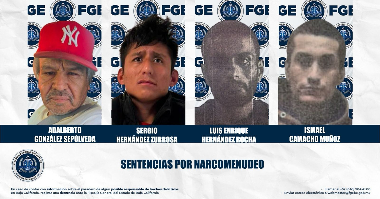 TIJUANA, BAJA CALIFORNIA. - La Fiscalía General del Estado, a través de la Fiscalía Especializada en Narcomenudeo, obtuvo sentencias de prisión para cuatro individuos por delitos contra la salud.