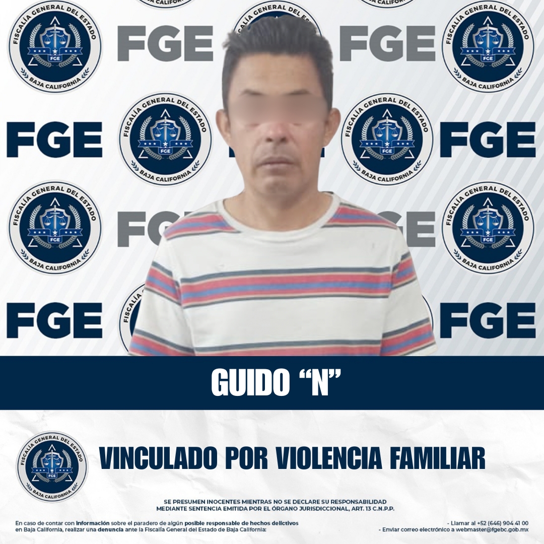 ENSENADA, BAJA CALIFORNIA. - La Fiscalía Regional de Ensenada, en colaboración con la Unidad de Investigación con Detenido, logró la detención y vinculación a proceso de Guido “N”, quien fue arrestado en flagrancia en la colonia Popular 89 por el delito de violencia familiar.
