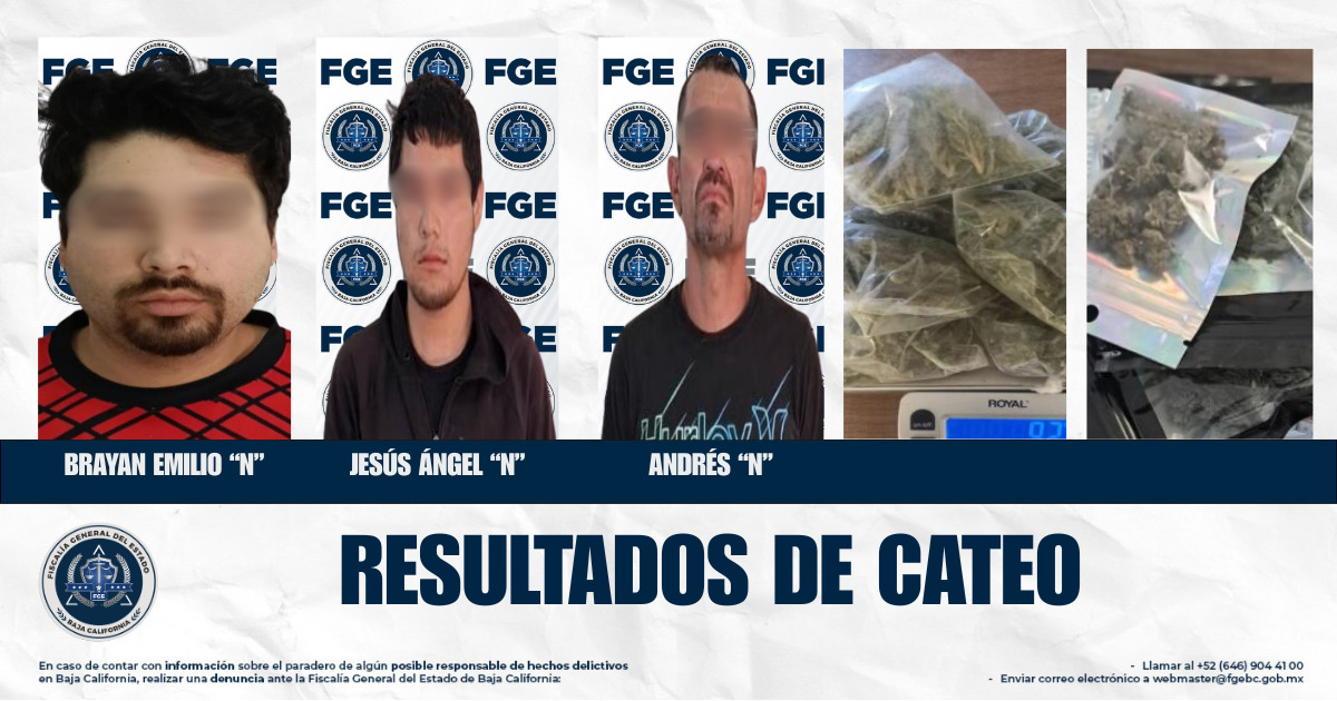 ENSENADA, BAJA CALIFORNIA. - Como parte de las acciones permanentes contra el narcomenudeo, la Fiscalía General del Estado ejecutó dos órdenes de cateo en distintos puntos de Ensenada. Como resultado, se logró la detención de tres personas y el aseguramiento de diversas dosis de droga.