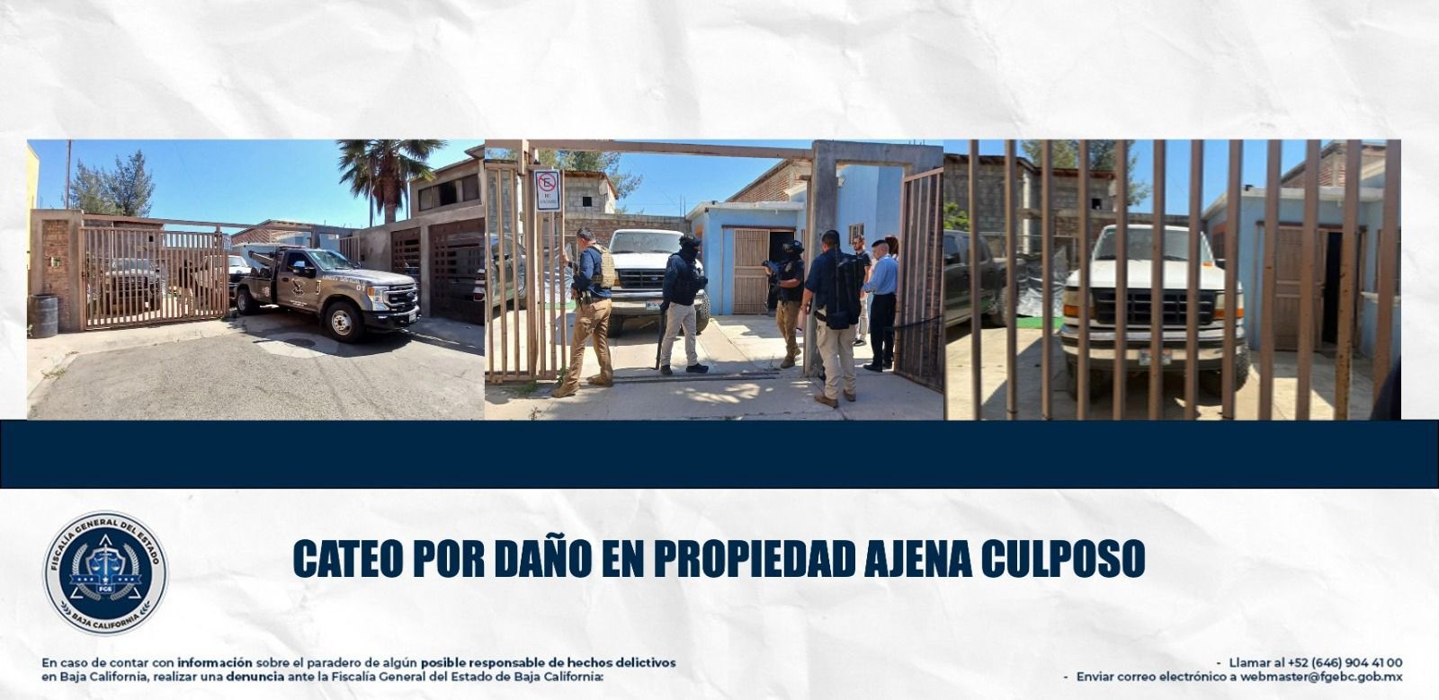 TECATE, BAJA CALIFORNIA. - La Fiscalía General del Estado, a través de la Fiscalía Regional de Tecate y su Unidad de Tramitación Masiva de Causas, cumplimentó una orden de cateo que permitió el aseguramiento de un vehículo relacionado con una investigación por el delito de daño en propiedad ajena por culpa.