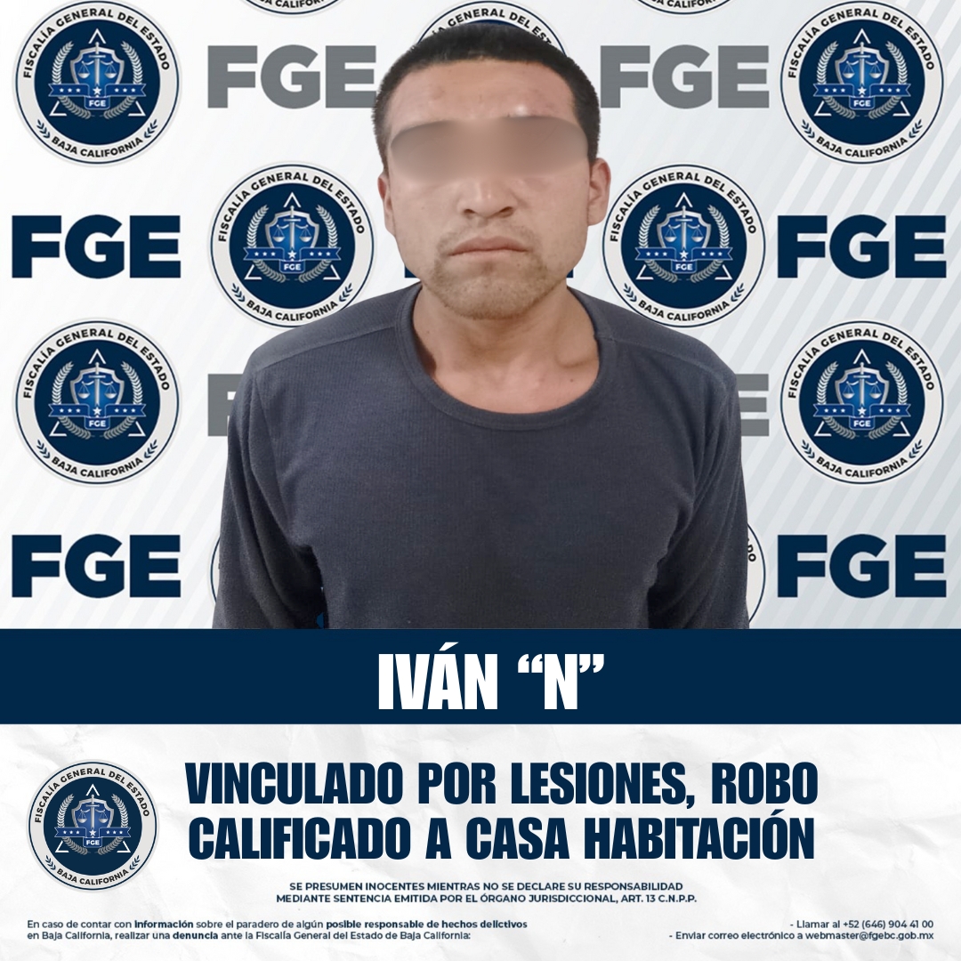 ENSENADA, BAJA CALIFORNIA. - La Fiscalía Regional de Ensenada logró la detención y vinculación a proceso de Iván “N”, por los delitos de lesiones y robo calificado a casa habitación.