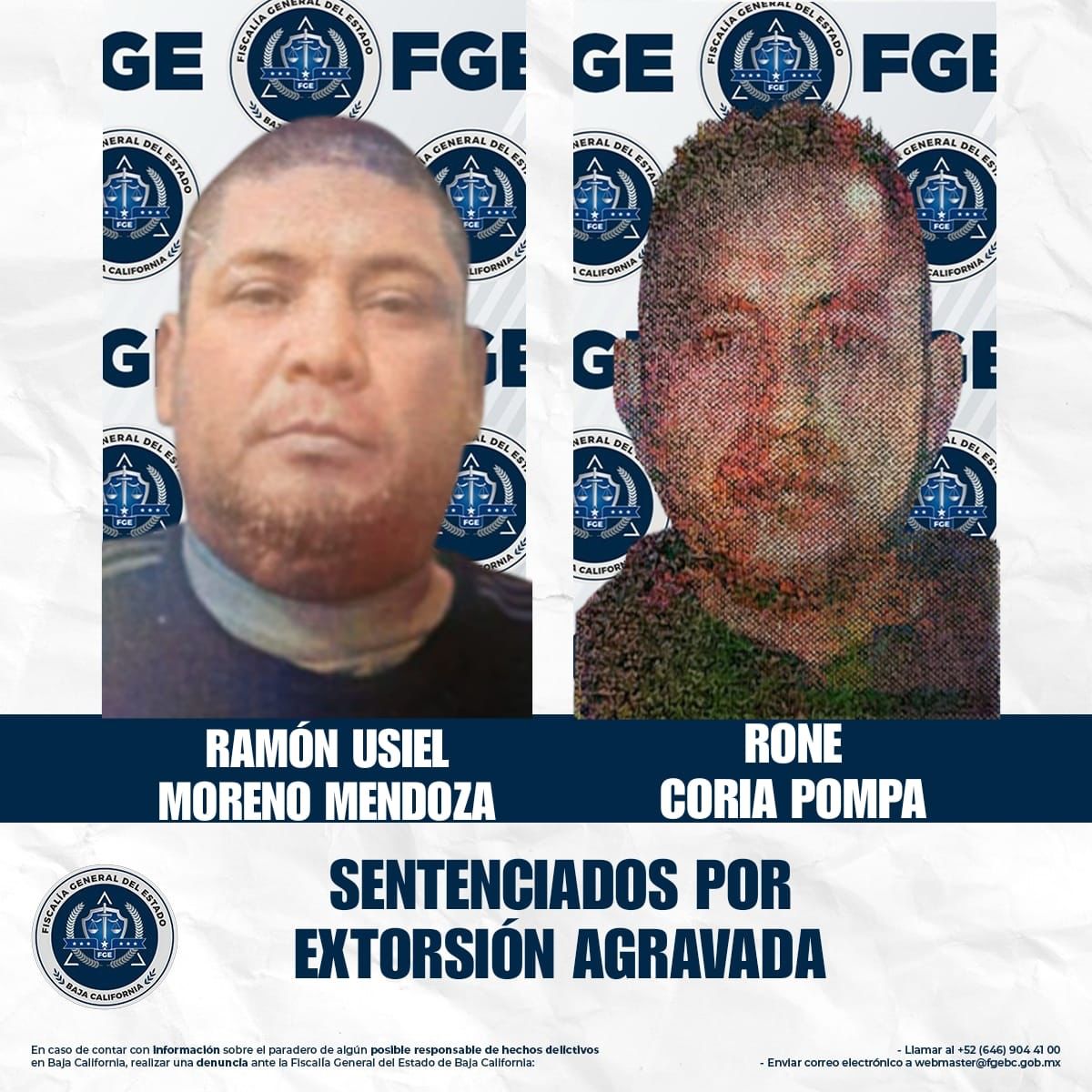 TIJUANA, BAJA CALIFORNIA. - La Fiscalía Regional de Tijuana obtuvo una sentencia condenatoria de 5 años de prisión contra Ramón Usiel Moreno Mendoza y Rone Coria Pompa por el delito de extorsión agravada. Los acusados fueron encontrados culpables de exigir pagos mensuales bajo amenazas de violencia a empleados de una empresa dedicada a la elaboración de prendas de vestir, ubicada Jardines de la Mesa en Tijuana.