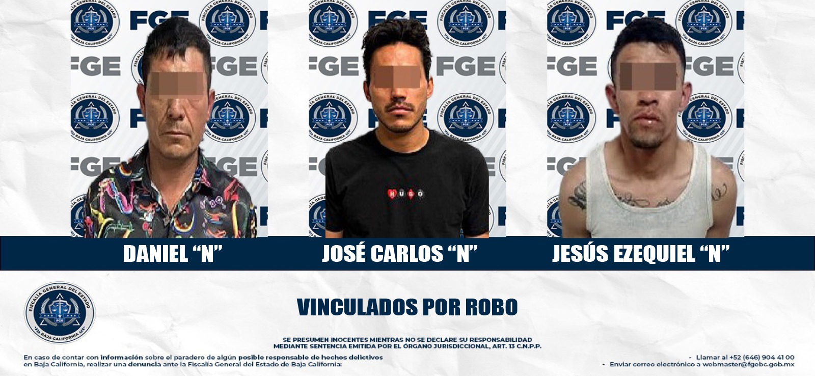 MEXICALI, BAJA CALIFORNIA. - Con base en las pruebas presentadas por la Fiscalía Regional de Mexicali, a través de las Unidades de Investigación de Robos Poniente y Robos Oriente, tres hombres relacionados en diversos robos cometidos fueron vinculados a proceso.