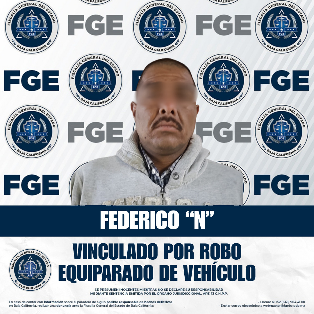 ENSENADA, BAJA CALIFORNIA. - Como resultado del trabajo coordinado de la Fiscalía Regional de Ensenada, a través de la Unidad de Investigación de Delitos con Detenido, se obtuvo la vinculación a proceso y la imposición de la prisión preventiva justificada como medida cautelar contra Federico “N”, por su probable responsabilidad en el delito de posesión de vehículo con reporte de robo.