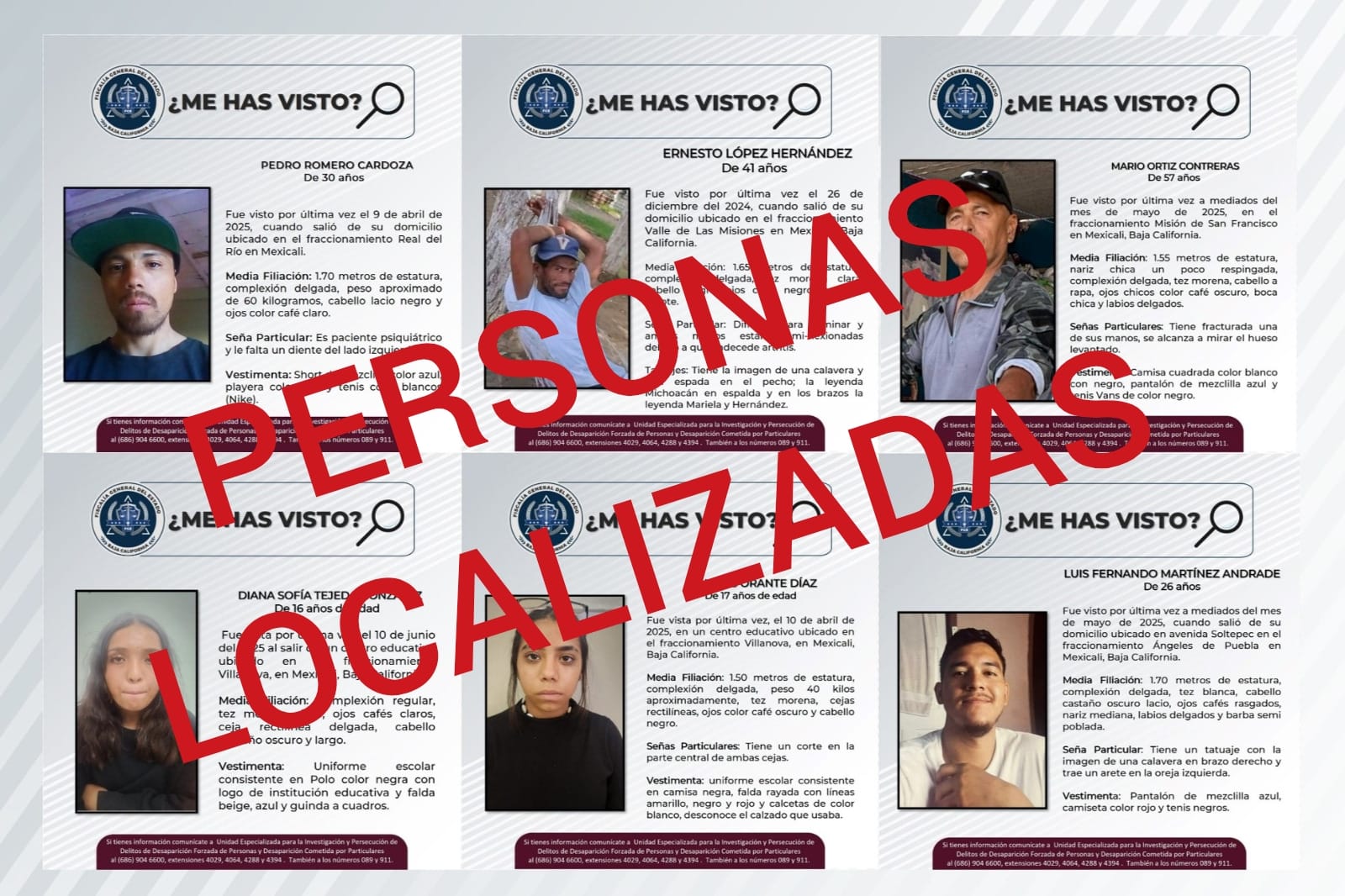 MEXICALI, BAJA CALIFORNIA. - La Fiscalía General del Estado de Baja California, a través de la Unidad Especializada para la Investigación y Persecución de Delitos de Desaparición Forzada y Desaparición Cometida por Particulares, logró la localización de seis personas que contaban con reporte de búsqueda.