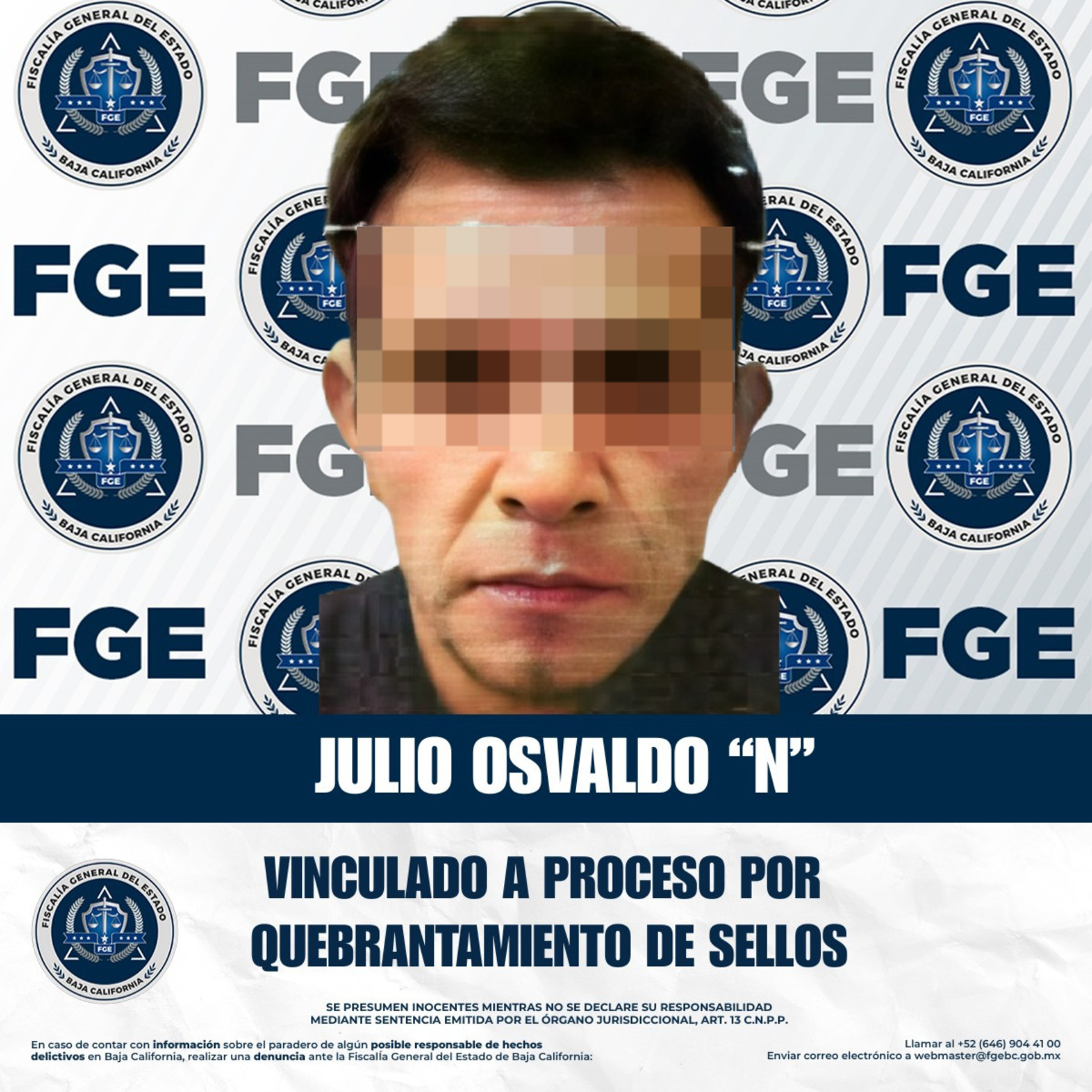 TECATE, BAJA CALIFORNIA. - La Fiscalía Regional de Tecate, a través de la Unidad de Investigación de Delitos con Detenido, logró que un juez de control vinculara a proceso a Julio Osvaldo “N” por su presunta responsabilidad en el delito de quebrantamiento de sellos, al presentar datos de prueba contundentes que acreditan su probable participación en los hechos.