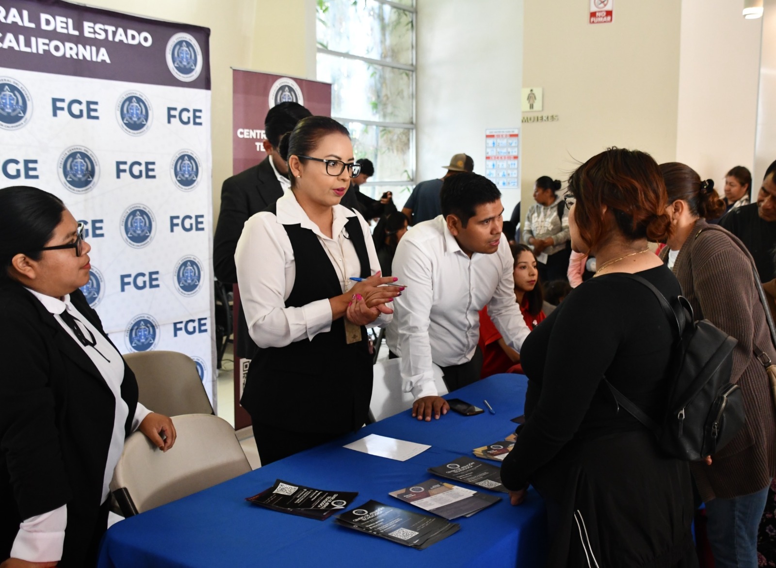 El Fiscal Regional de Ensenada, Miguel Ángel Pérez Rojas, participó en el acto protocolario junto a otras autoridades y atendió personalmente a las asistentes en el módulo de la Fiscalía, acompañado por la subdirectora de las Unidades de Atención Ciudadana y Justicia Alternativa Penal Zona Sur, Julieta Castañeda Ceseña; el Fiscal Enlace en Ensenada, Sergio Pineda Ortiz; y personal especializado.