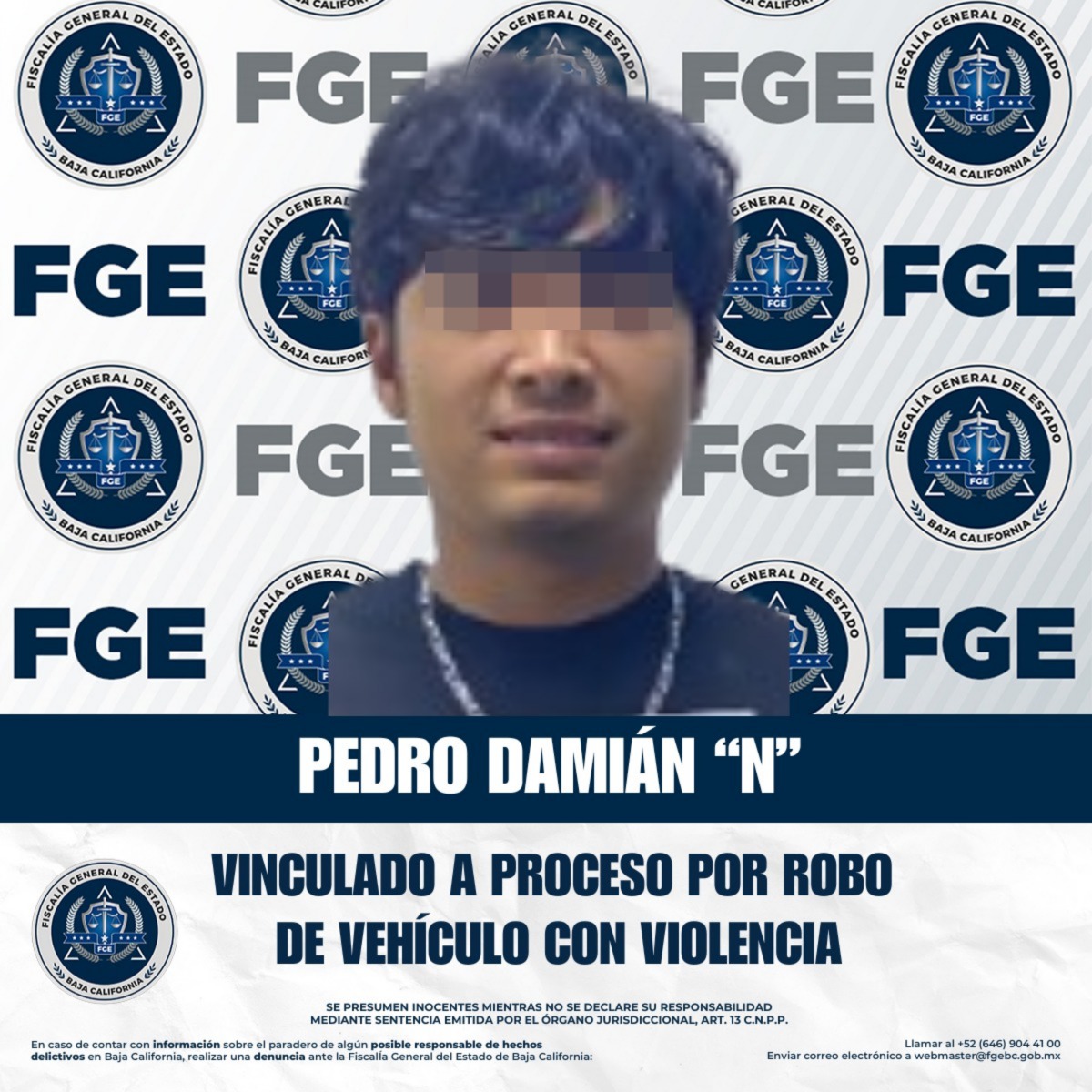 TIJUANA, BAJA CALIFORNIA. - La Fiscalía Regional de Tijuana, a través de la Unidad de Investigación con Detenido, informa que logró obtener vinculación a proceso en contra de Pedro Damián “N”, por su probable responsabilidad en el delito de robo calificado de vehículo ejecutado con violencia.