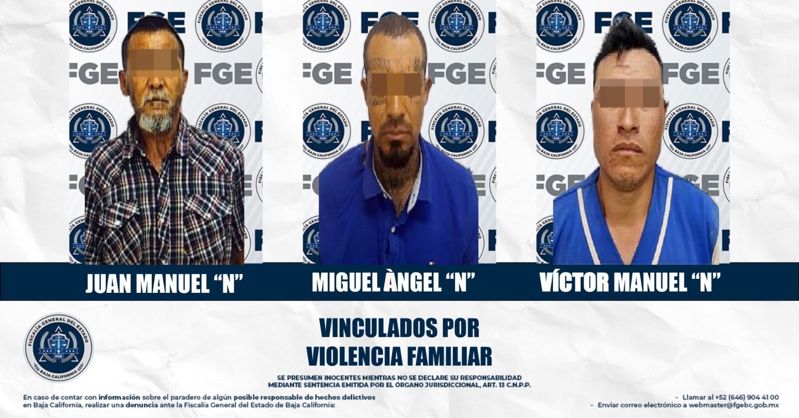 MEXICALI, BAJA CALIFORNIA. - La Fiscalía Regional de Mexicali, a través de la Unidad de Investigación de Delitos Foránea Guadalupe Victoria, obtuvo la vinculación a proceso de tres individuos por su presunta participación en el delito de violencia familiar.