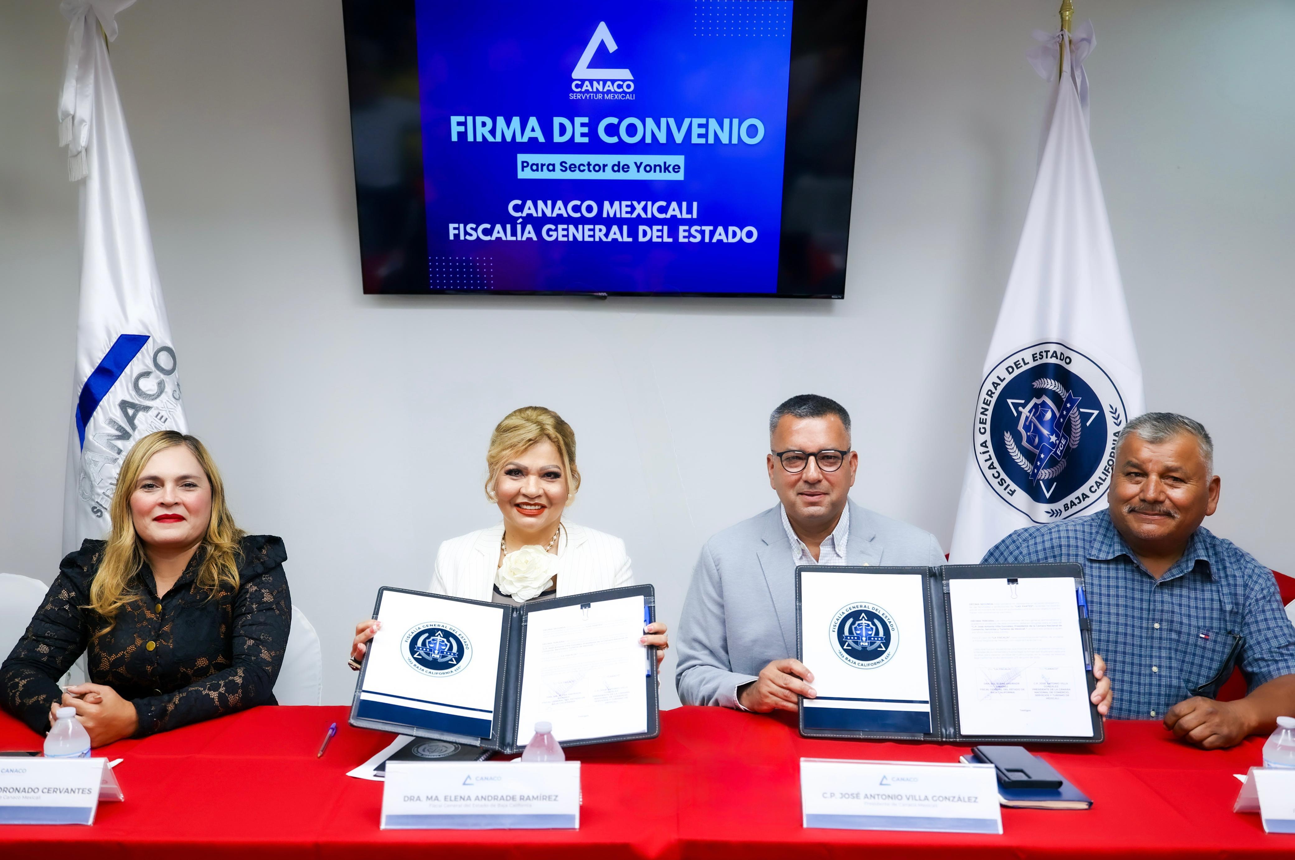 MEXICALI, BAJA CALIFORNIA. - Con la finalidad de reforzar la coordinación institucional y prevenir el robo de vehículos, la Fiscal General del Estado, Dra. Ma. Elena Andrade Ramírez, firmó un convenio de colaboración con representantes de yonkes afiliados a CANACO Mexicali, encabezados por su presidente, José Antonio Villa González.