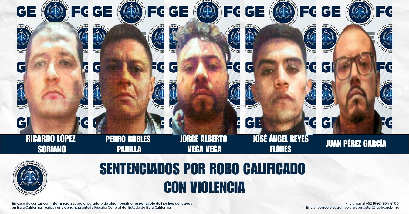 TIJUANA, BAJA CALIFORNIA. - La Fiscalía General del Estado, a través de la Unidad de Investigación de Robos Zona Centro, adscrita a la Fiscalía Regional de Tijuana, informa que se logró la sentencia condenatoria en contra de cinco hombres por el delito de robo calificado, cometido por dos o más personas y ejecutado con violencia.