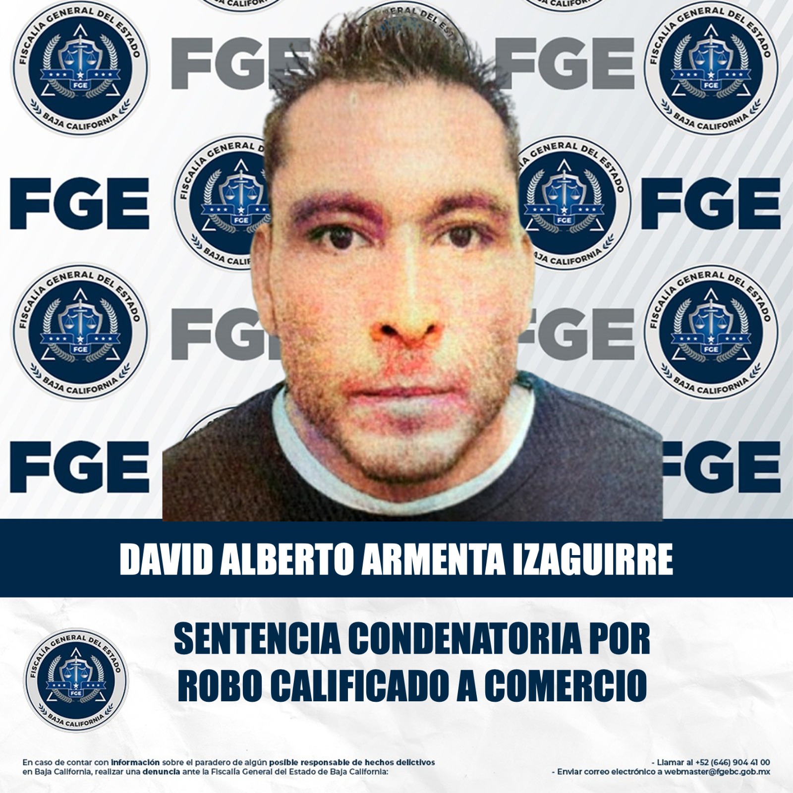 TIJUANA, BAJA CALIFORNIA. - La Fiscalía Regional de Tijuana, a través de la Unidad de Investigación de Robos La Mesa, informa que se obtuvo sentencia condenatoria en contra de David Alberto Armenta Izaguirre, por su responsabilidad penal en el delito de robo calificado cometido a comercio abierto al público.