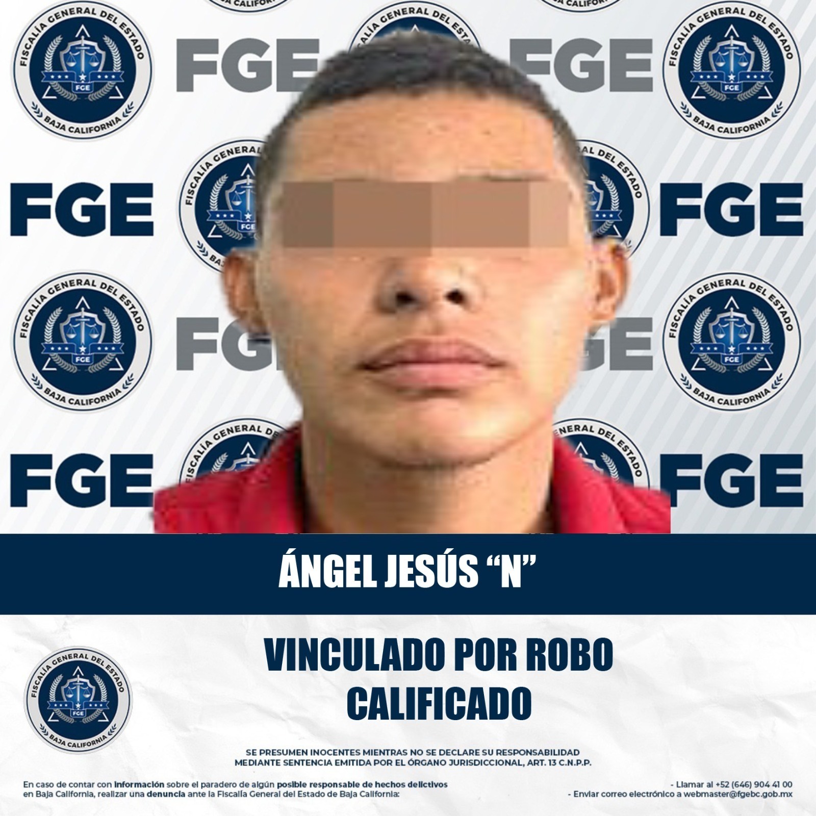MEXICALI, BAJA CALIFORNIA. - La Fiscalía Regional de Mexicali, a través de la Unidad de Investigación de Robos Poniente, obtuvo la vinculación a proceso de Ángel Jesús “N”, por su presunta participación en el delito de robo calificado, cometido con violencia en establecimiento comercial abierto al público, y en perjuicio de una persona con discapacidad y mayor de 60 años.