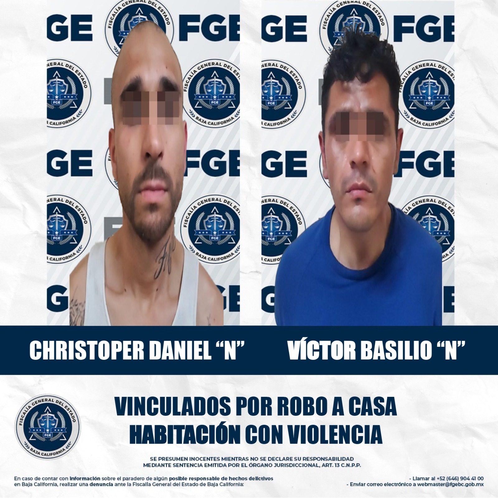 MEXICALI, BAJA CALIFORNIA. - La Fiscalía Regional de Mexicali, a través de la Unidad de Investigación de Delitos de Robo Oriente, logró la vinculación a proceso de Christopher Daniel “N” y Víctor Basilio “N”, por su presunta participación en los delitos de robo con violencia a casa habitación, privación ilegal de la libertad y robo de vehículo.