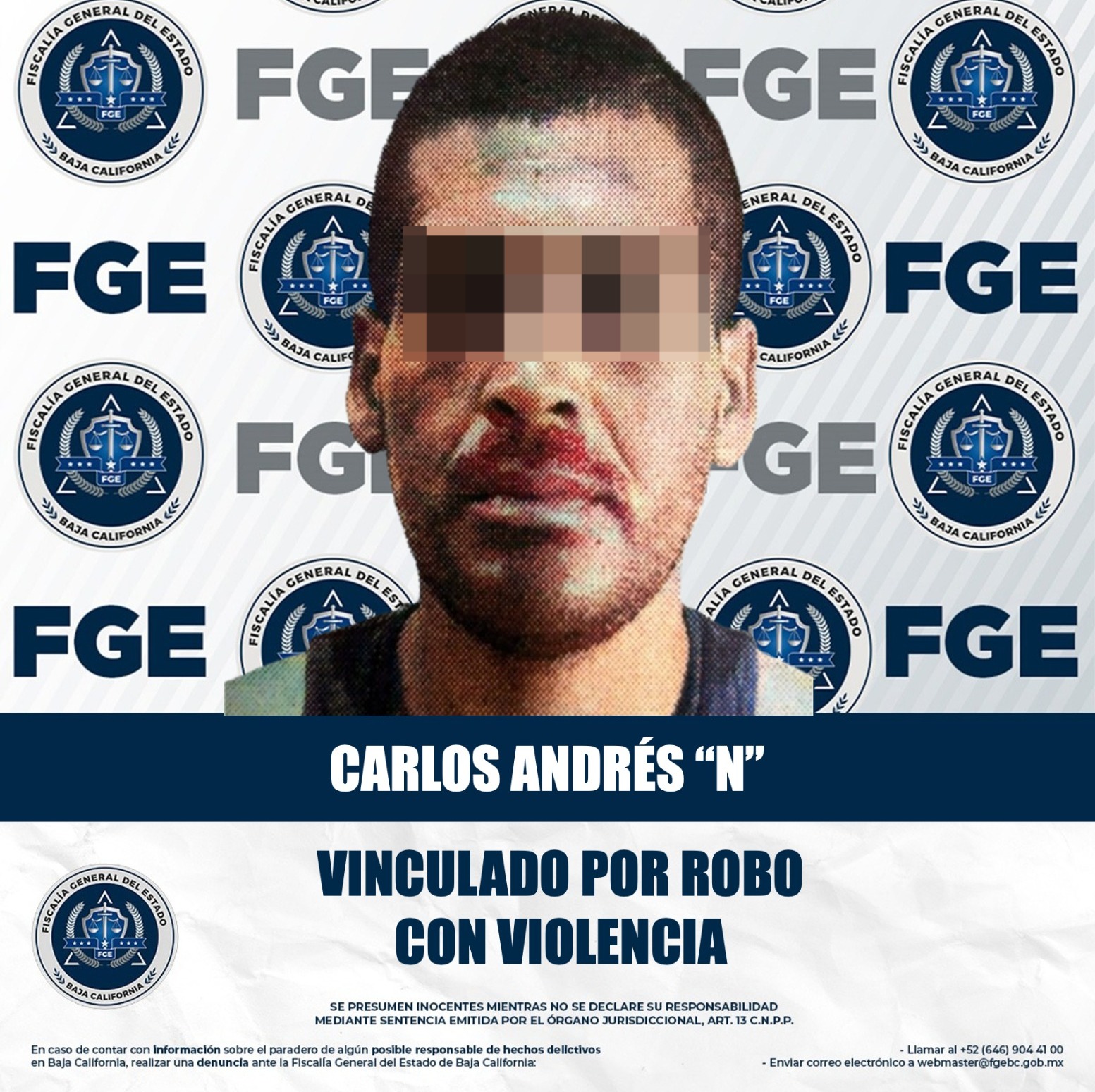 TIJUANA, BAJA CALIFORNIA. - La Fiscalía Regional de Tijuana, a través de su Unidad de Investigación, informa que Carlos Andrés “N” ha sido vinculado a proceso penal por el delito de robo con violencia, cometido en esta ciudad el 17 de julio de 2024.