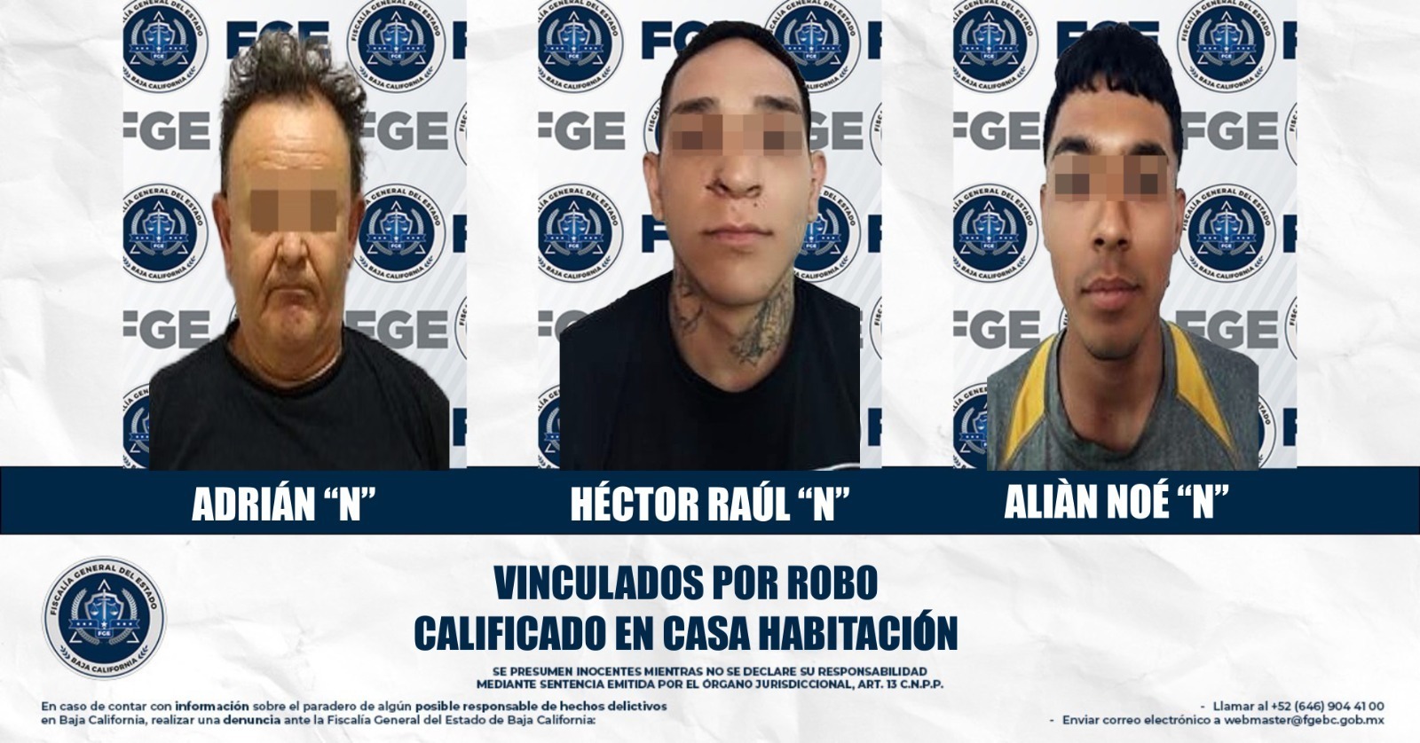 MEXICALI, BAJA CALIFORNIA. - La Fiscalía Regional de Mexicali, a través de la Unidad de Investigación de Delitos de Robo Poniente y la Unidad de Investigación de Delitos con Detenidos Oriente, obtuvo la vinculación a proceso de tres individuos del sexo masculino, esto debido a su presunta participación en el delito de robo calificado en casa habitación.