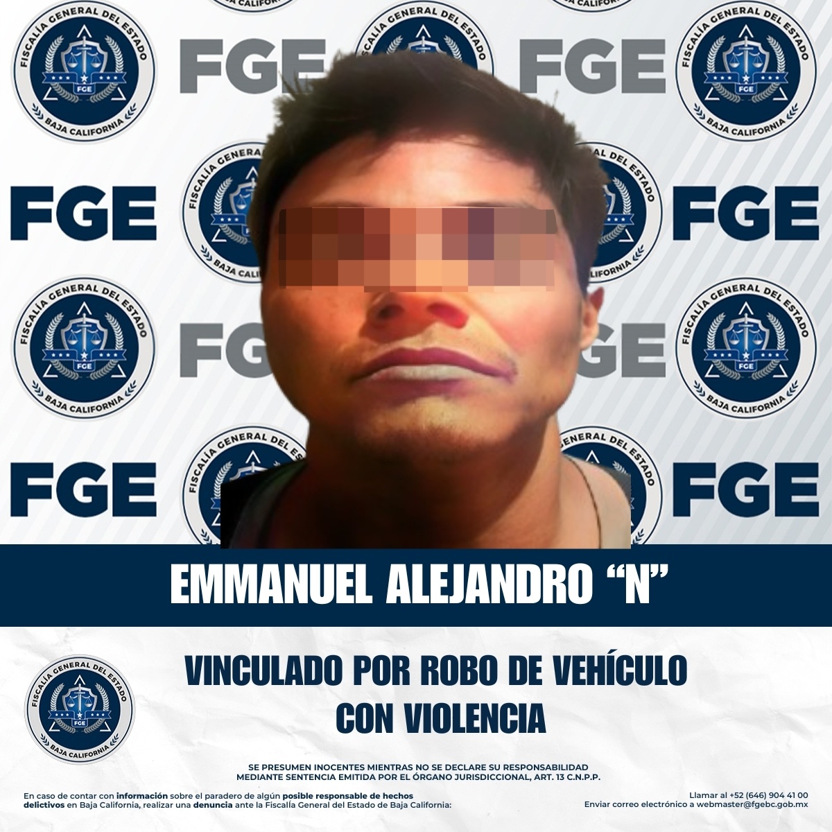 TIJUANA, BAJA CALIFORNIA. - La Fiscalía Regional de Tijuana, a través de la Unidad de Investigación con Detenidos, logró la vinculación a proceso de Emmanuel Alejandro “N” por el delito de robo de vehículo ejecutado con violencia.