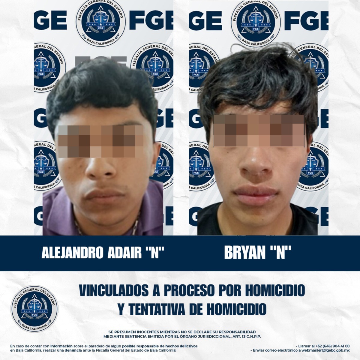 TIJUANA, BAJA CALIFORNIA. - La Fiscalía General del Estado de Baja California, encabezada por la Dra. Ma. Elena Andrade Ramírez, a través de la Fiscalía Especializada en Delitos contra la Vida, ha logrado obtener dos vinculaciones a proceso penal por los delitos de homicidio calificado y homicidio calificado en grado de tentativa. Los imputados, Bryan “N” y Alejandro Adair “N”, fueron detenidos en flagrancia el 17 de junio de 2025, por su presunta participación en un ataque armado ocurrido en la Colonia Francisco Villa de Tijuana.