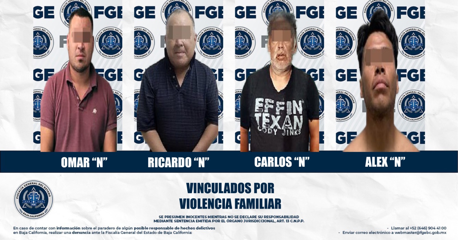 MEXICALI, BAJA CALIFORNIA. - La Fiscalía Regional de Mexicali, a través de la Unidad de Investigación Foránea de Ciudad Morelos, logró la vinculación a proceso de cuatro hombres acusados de cometer actos de violencia en contra de sus familiares en distintos puntos del Valle de Mexicali.