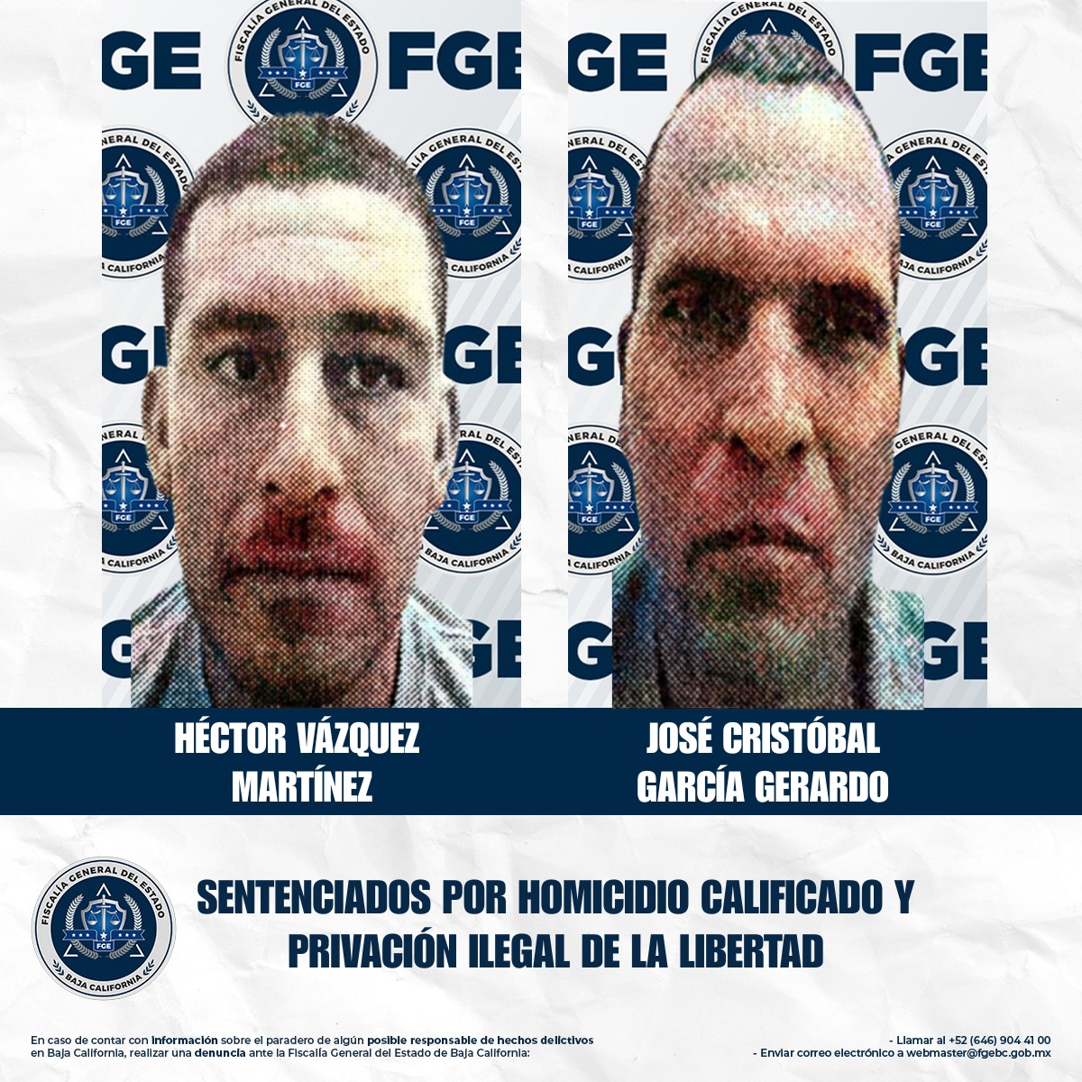 TIJUANA, BAJA CALIFORNIA. - La Fiscalía General del Estado, a través de la Coordinación de Averiguaciones Previas y Control de Proceso, informa que, como resultado de labores de investigación sólidas y la presentación de pruebas contundentes ante la autoridad judicial, se obtuvieron dos sentencias condenatorias en contra de Héctor Vázquez Martínez, alias “El Cuate”, y José Cristóbal García Gerardo, alias “El Cholo, El Pollo, El Negro o El Taxista”, por su responsabilidad penal en la comisión de los delitos de homicidio calificado y privación ilegal de la libertad personal.